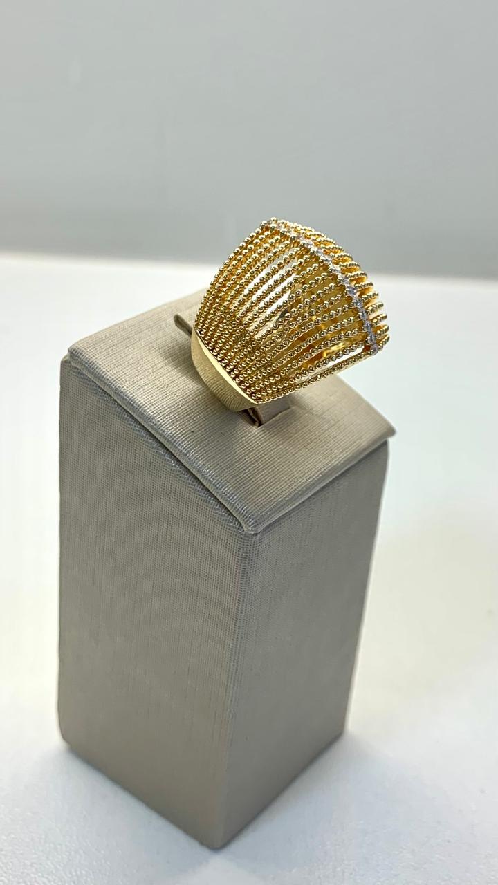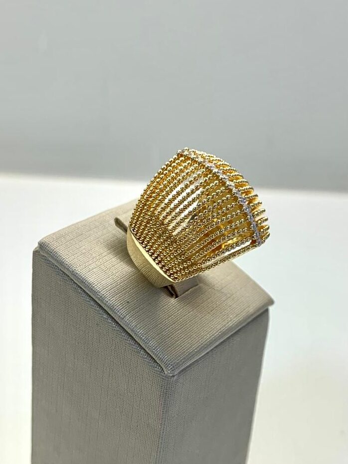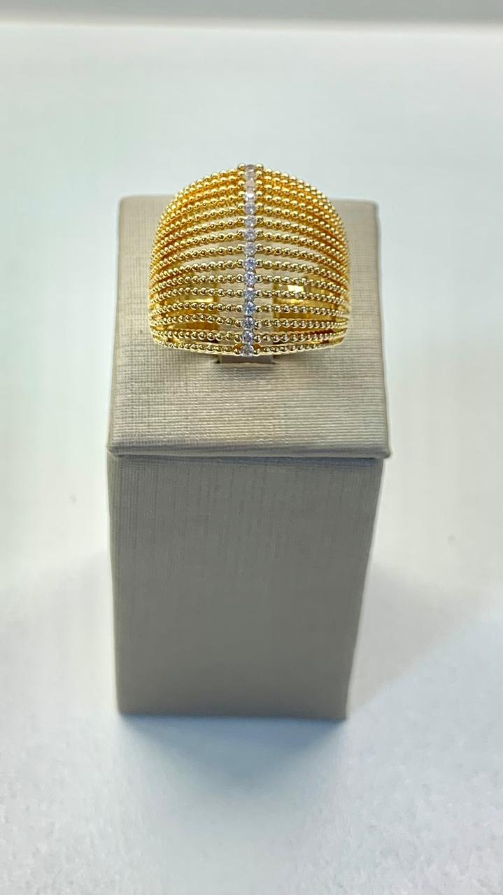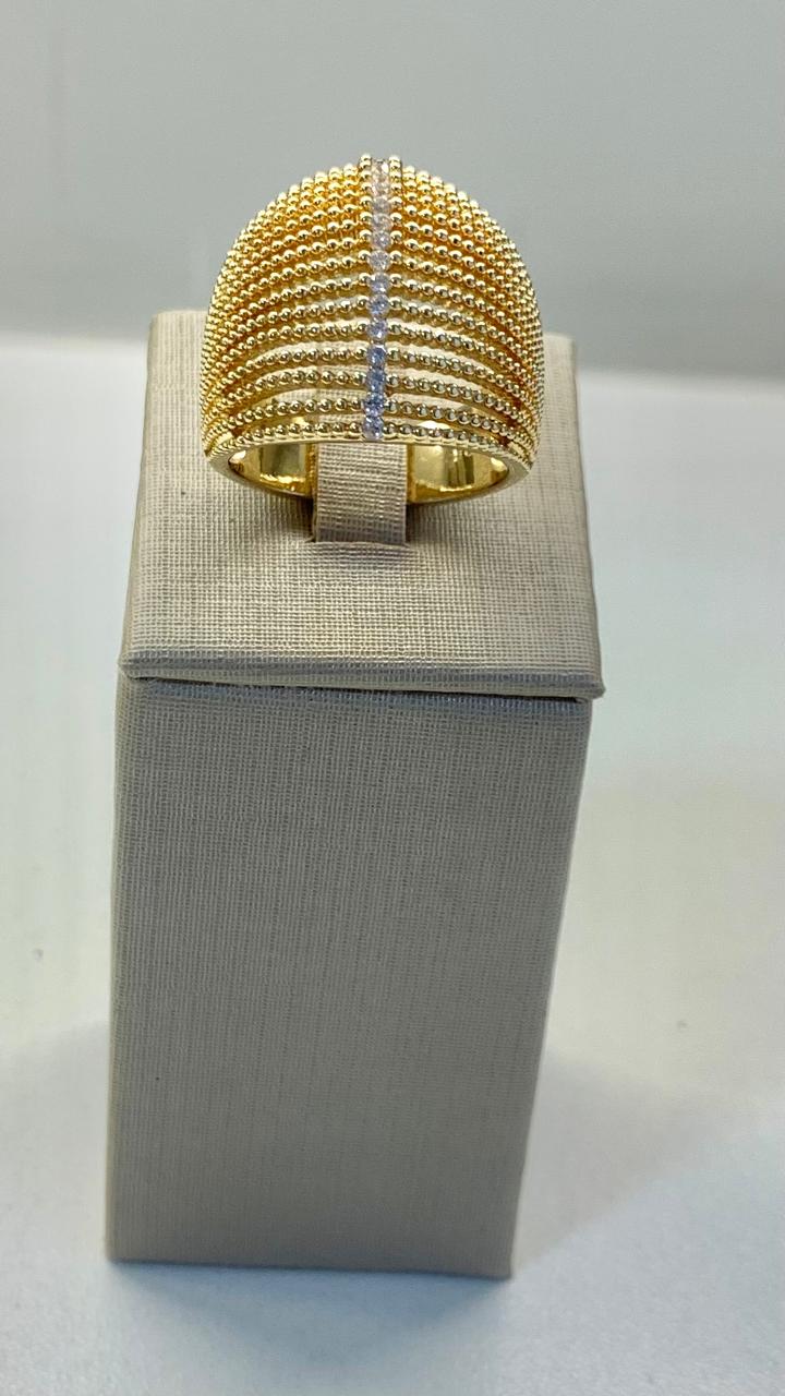Anel de prata 925 com banho de ouro 18k, com 15 fileiras de mini esferas e um filete de zircônias brancas.