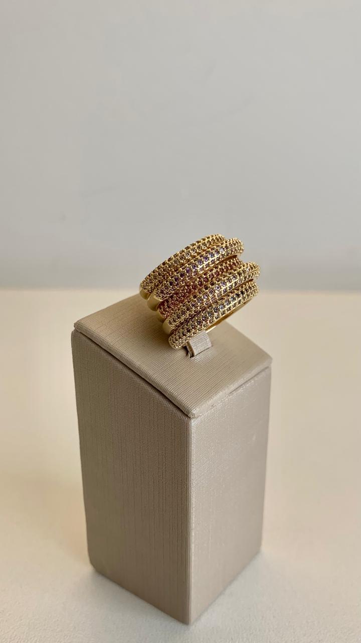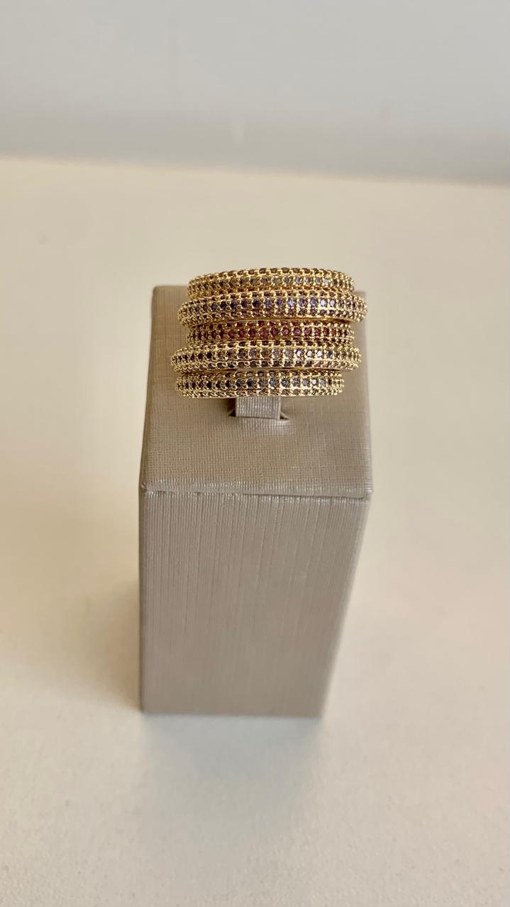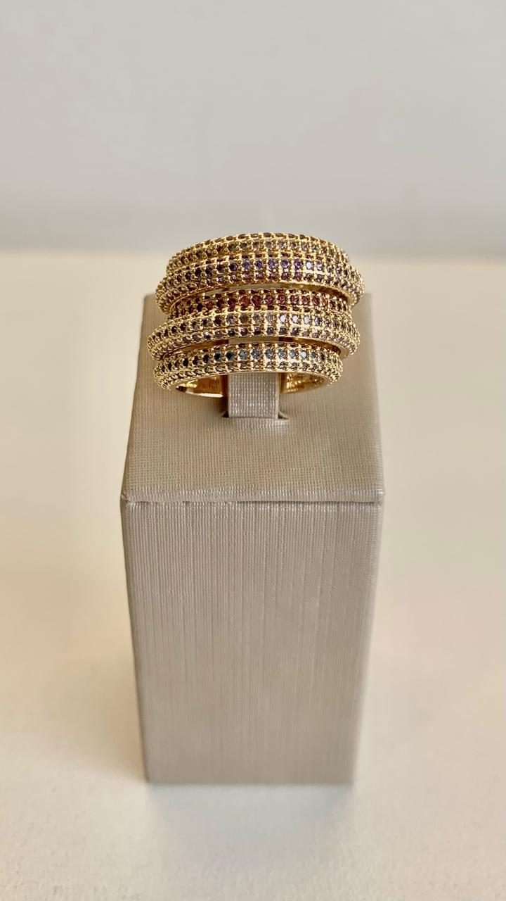 Anel 5 fileiras cravejadas de zircônias coloridas, banhado a ouro 18k.