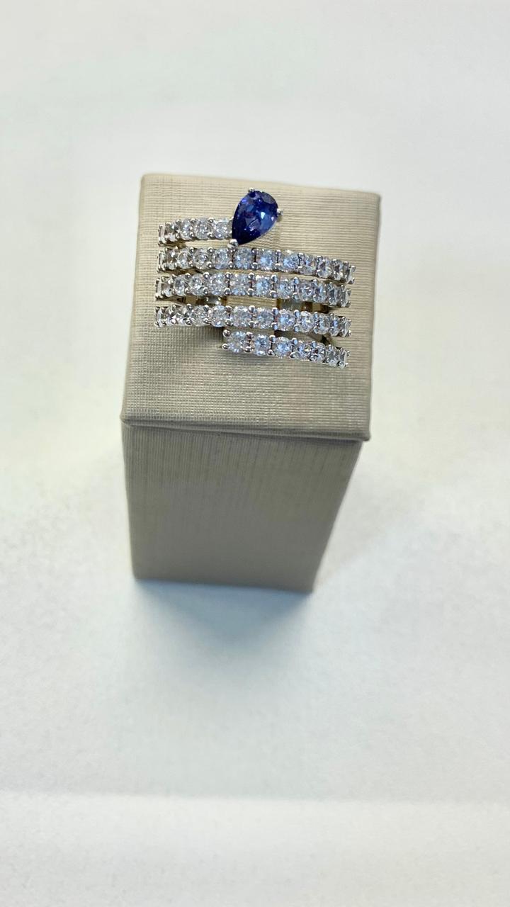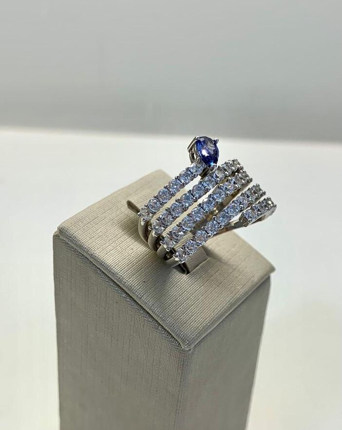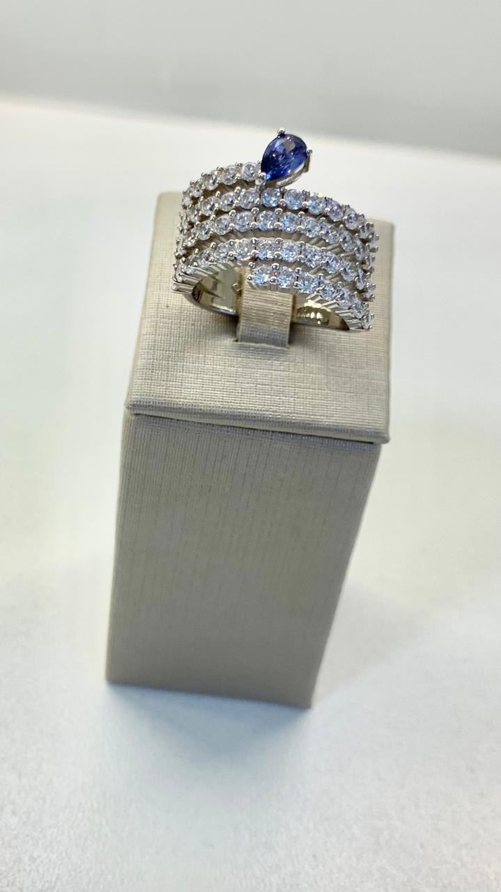 Anel 5 fileiras de zircônias com gota de tanzanita em prata 925.