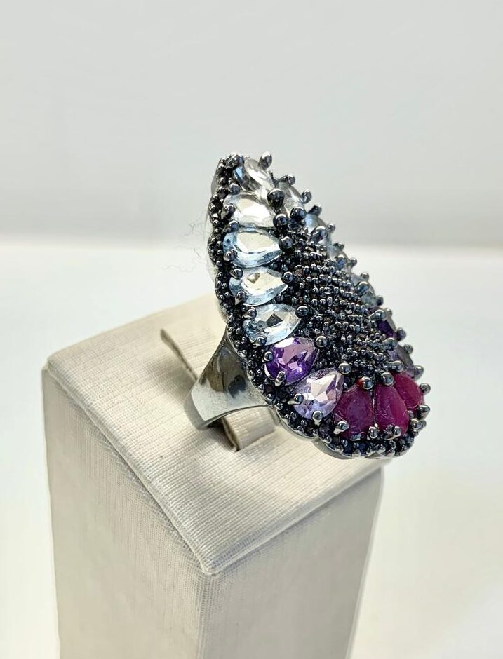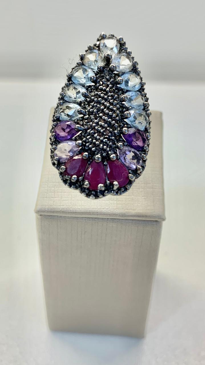 Anel de ródio negro, com zircônias de ametista, rubi e água marinha, cravejado de zircônias negras.