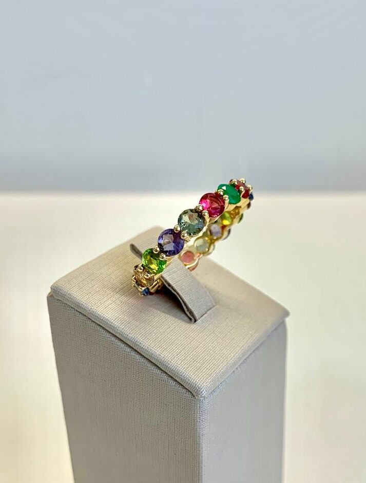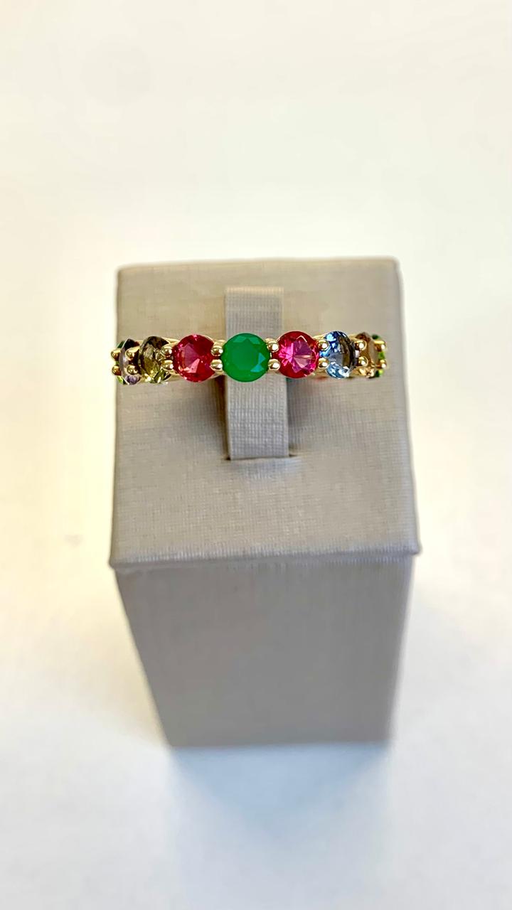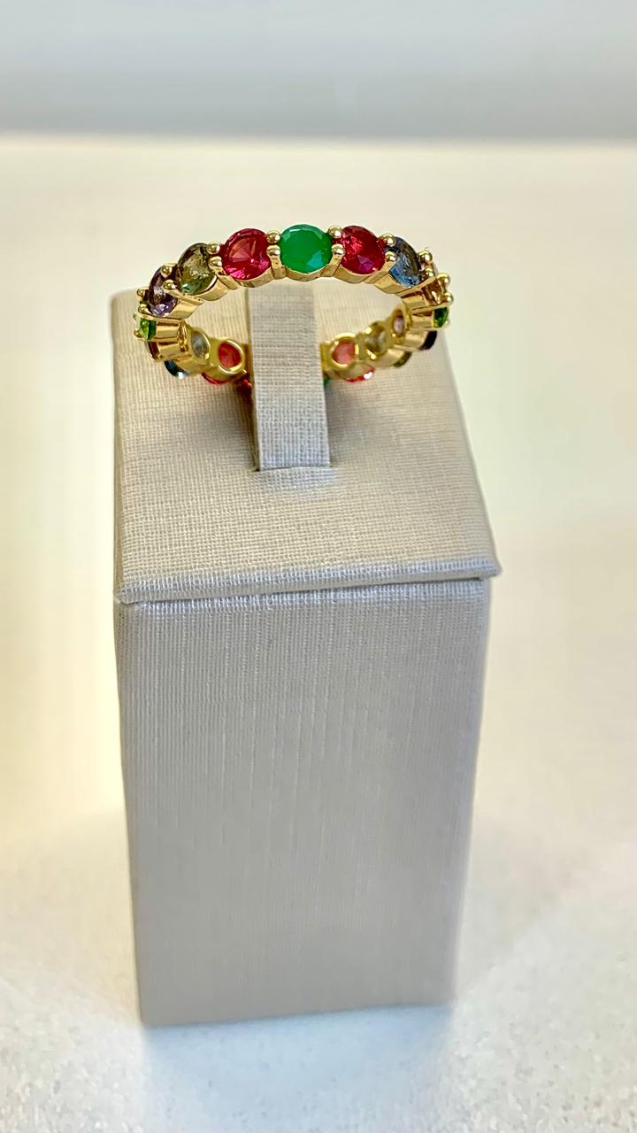 Anel banhado a ouro 18k, com zircônias coloridas.