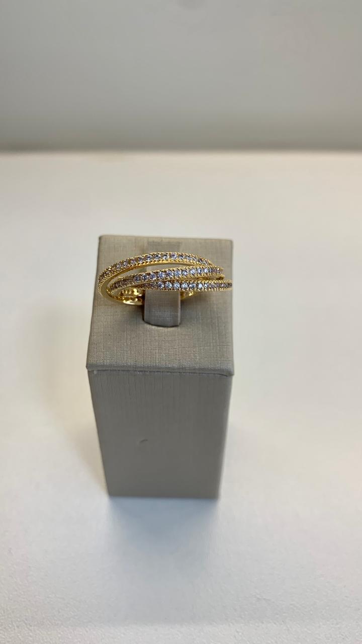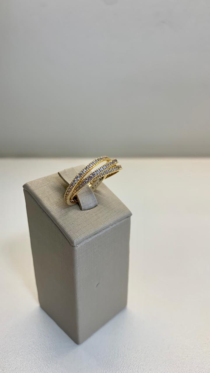Anel entrelaçado trinity cravejado de zircônias brancas, banhado a ouro18k.
