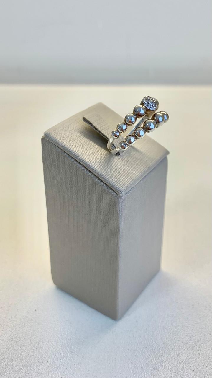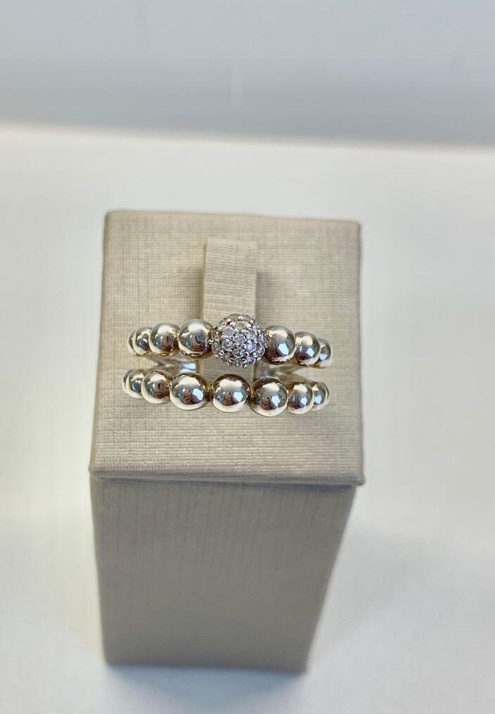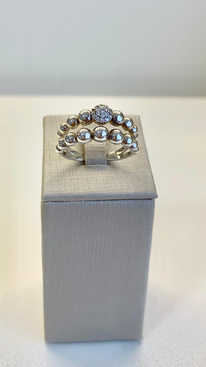 Anel de esferas lisas e esfera central com zircônias, em prata 925.