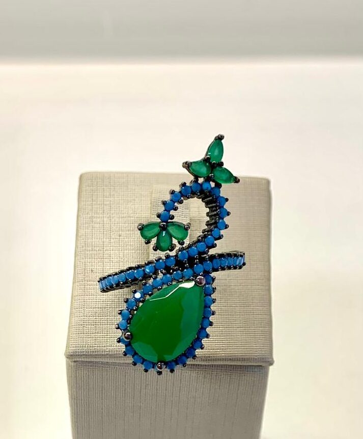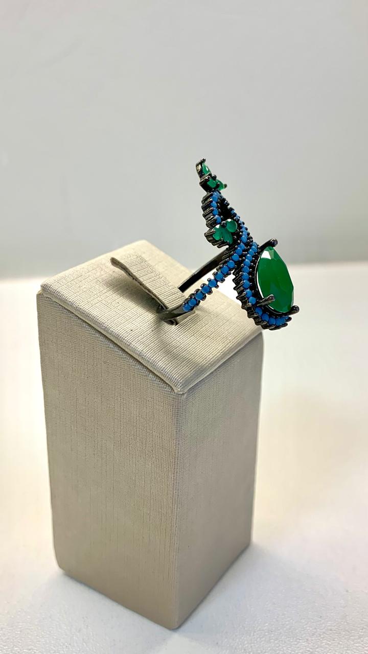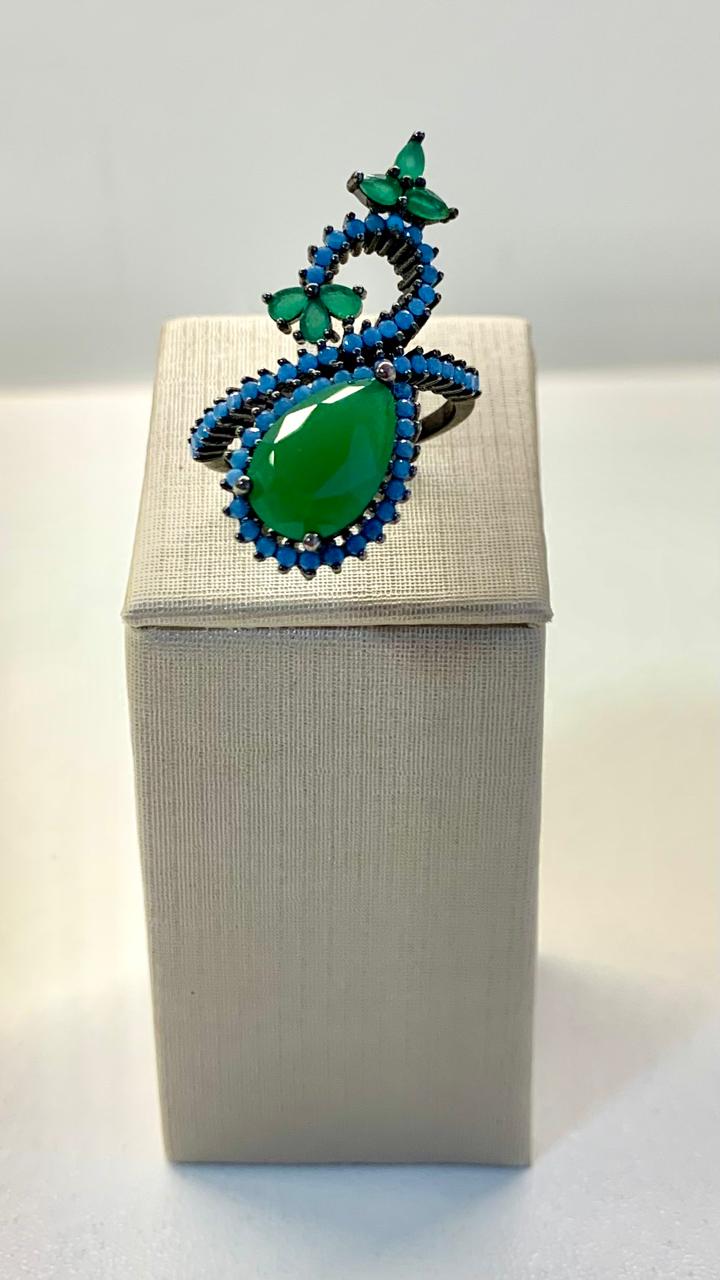 Anel com pedras naturais de esmerada e zircônias azul turquesa, em ródio negro.
