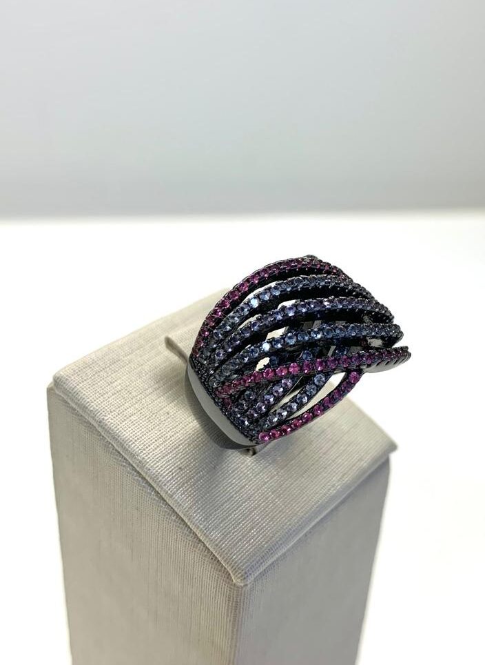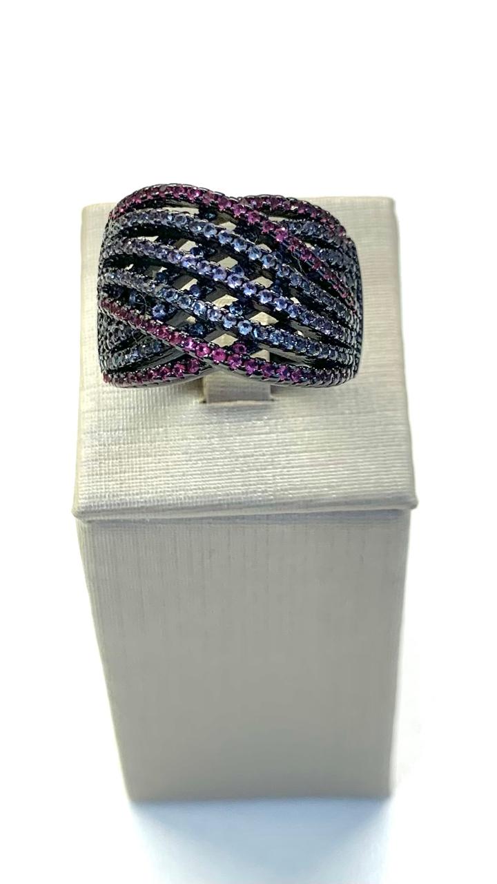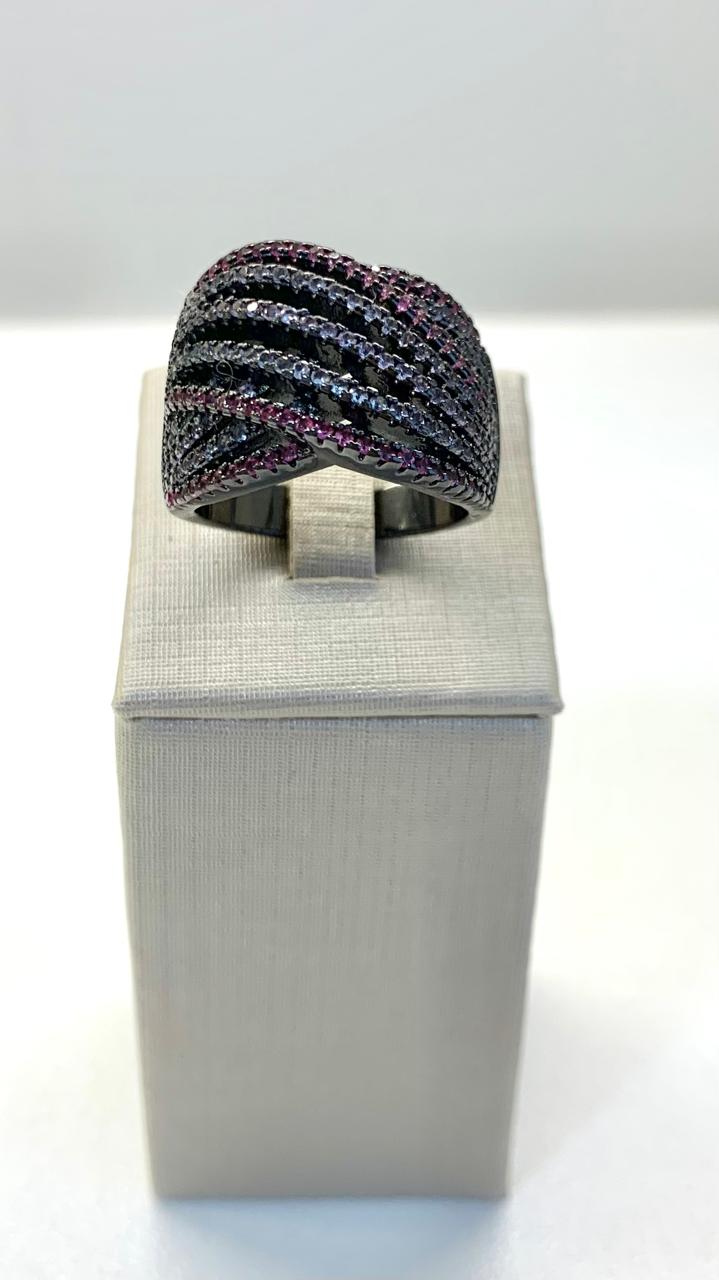 Anel de ródio negro, com 5 fileiras cravejadas com zircônias coloridas.