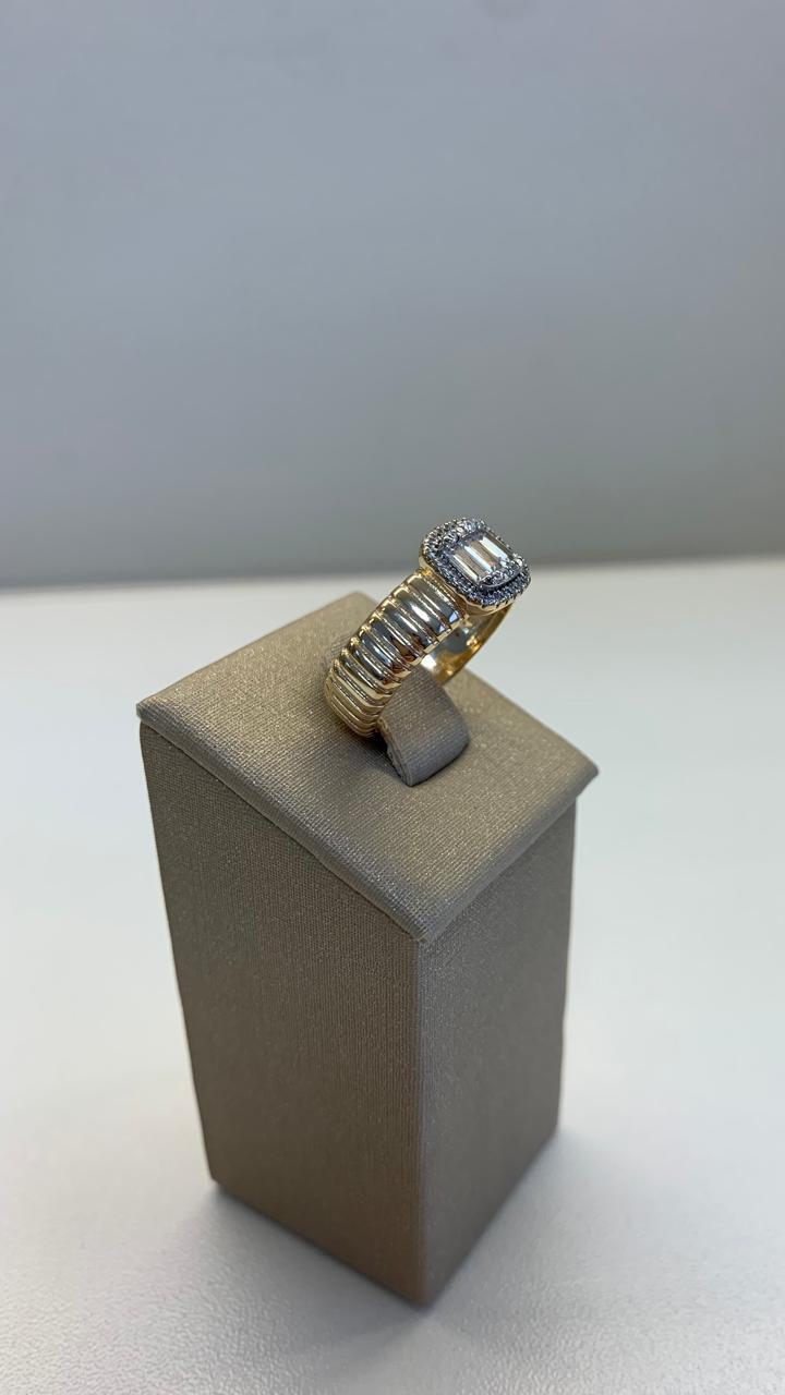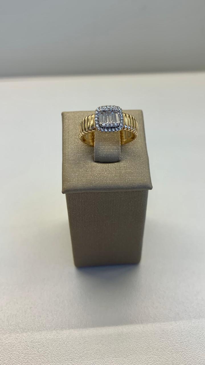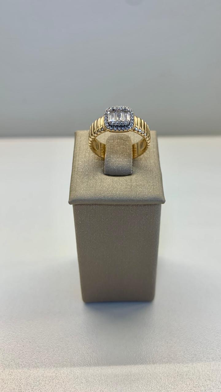 Anel frisado quadrado baguetado e zircônias brancas, em prata 925 com banho de ouro 18k.