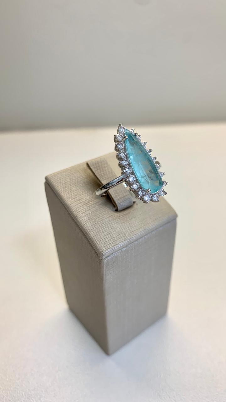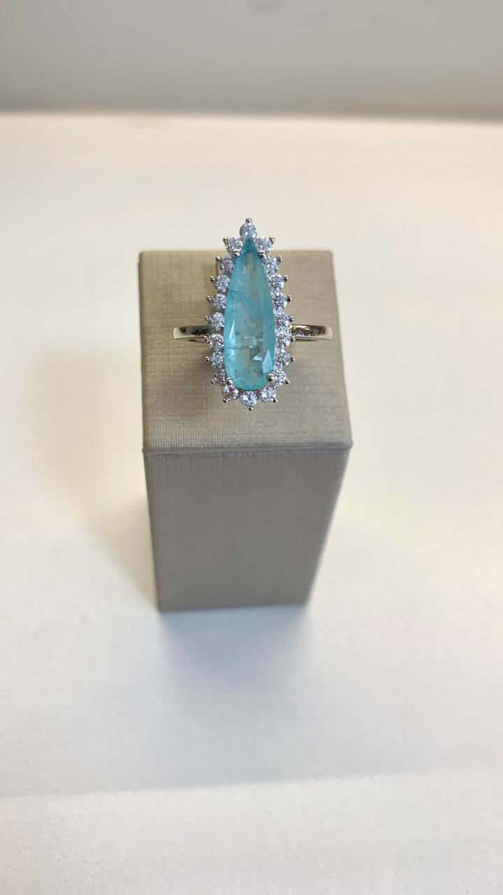 Anel gota alongada turmalina cravejada com zircônias brancas, em prata 925.
