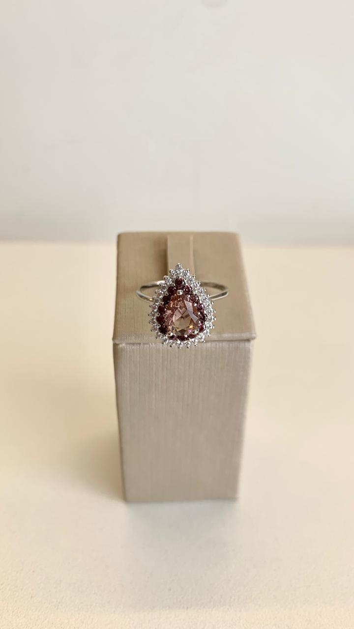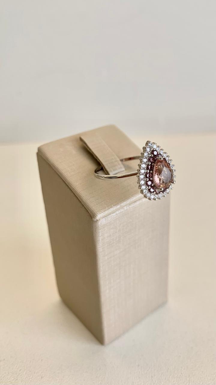 Anel gota morganita com cravação de zircônias em volta, em prata 925.