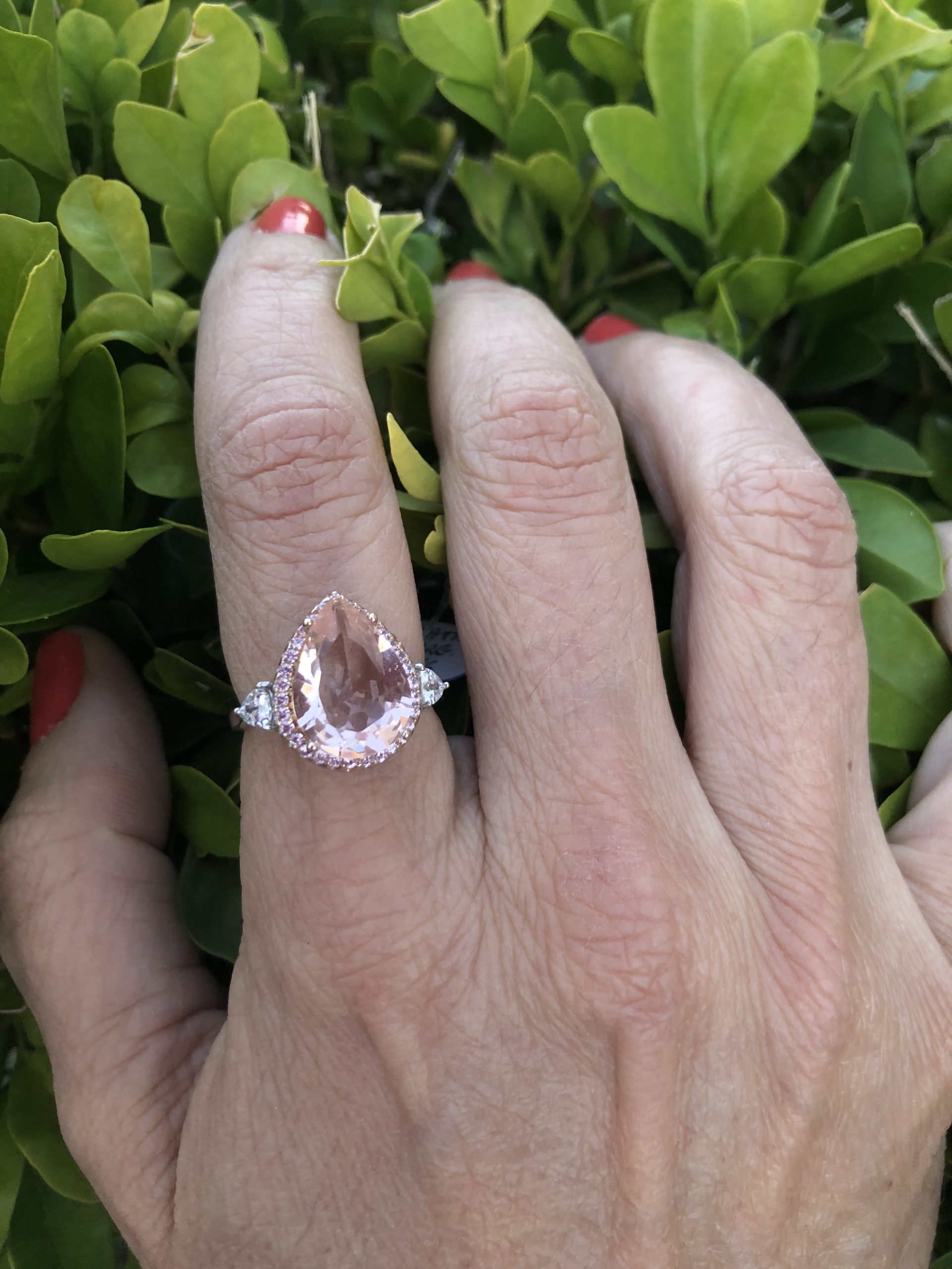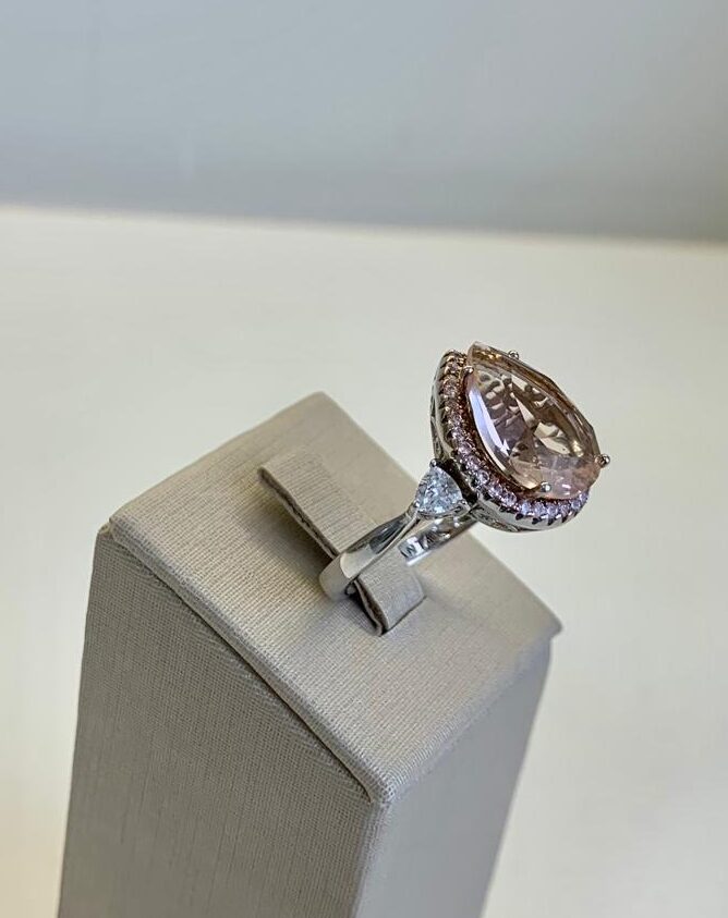 Anel gota com pedra morganita com zircônias brancas e cor de rosa, em prata 925.