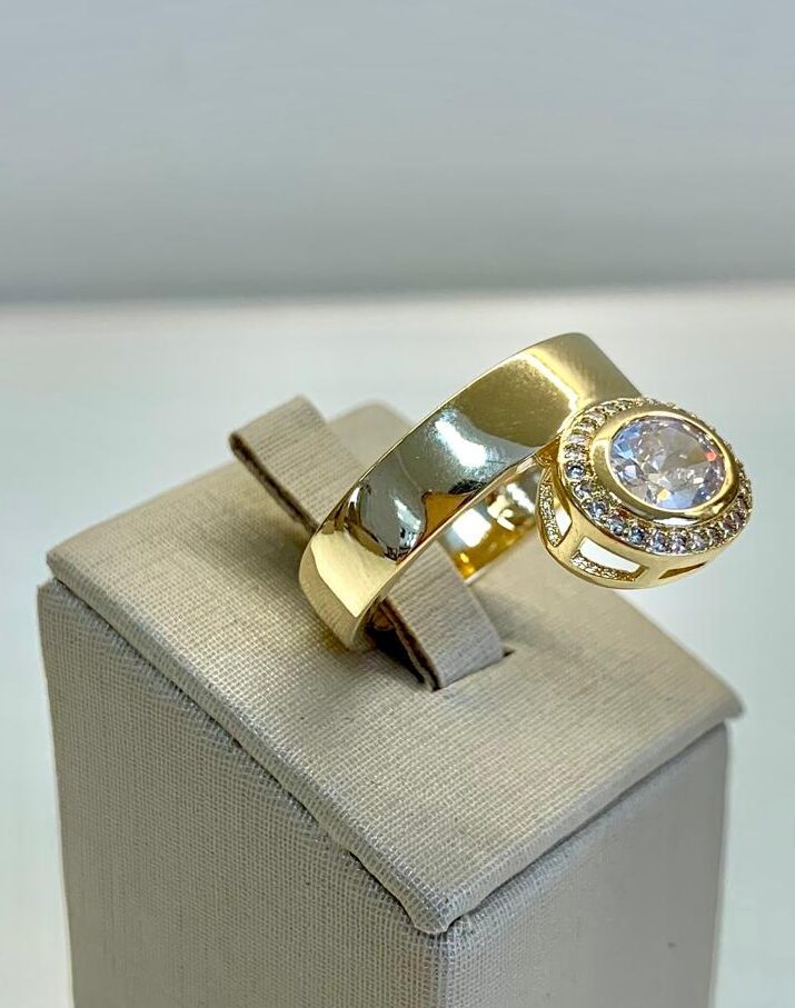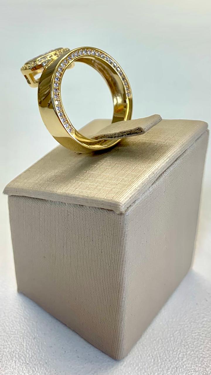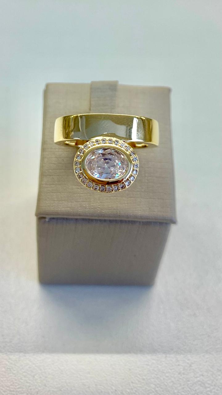 Anel banhado a ouro 18k, com uma pedra de zircônia oval cravejada com zircônias.