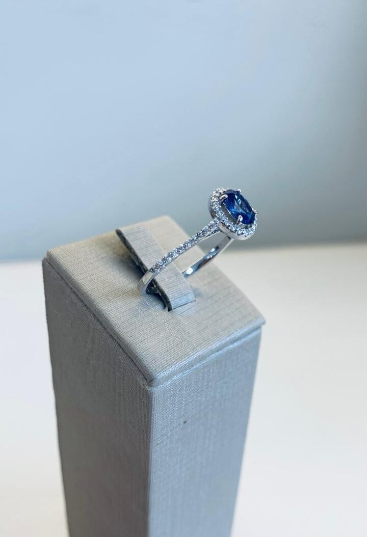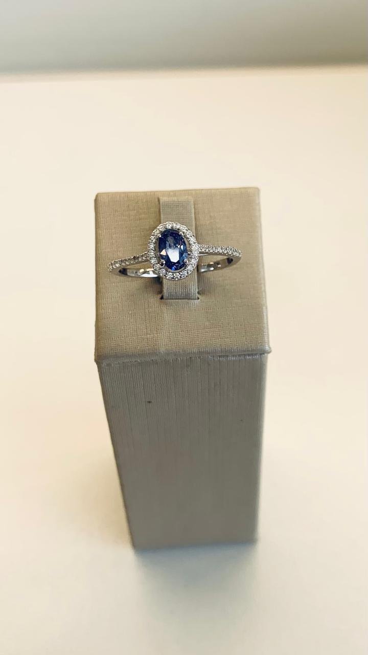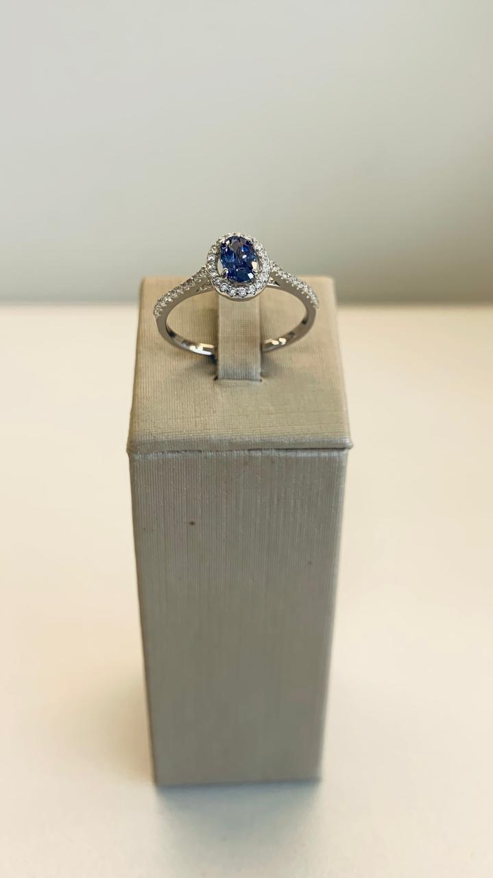 Anel oval de tanzanita com zircônias brancas em volta, em prata 925.