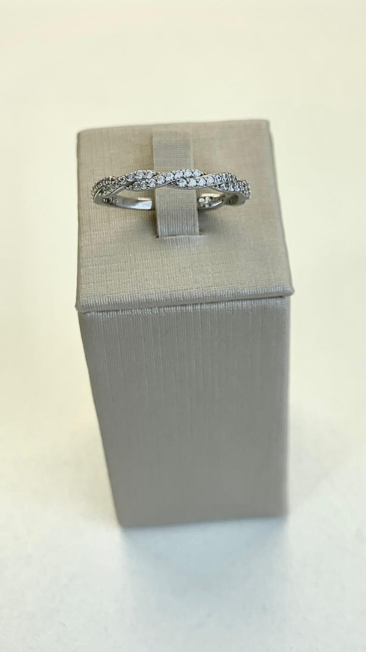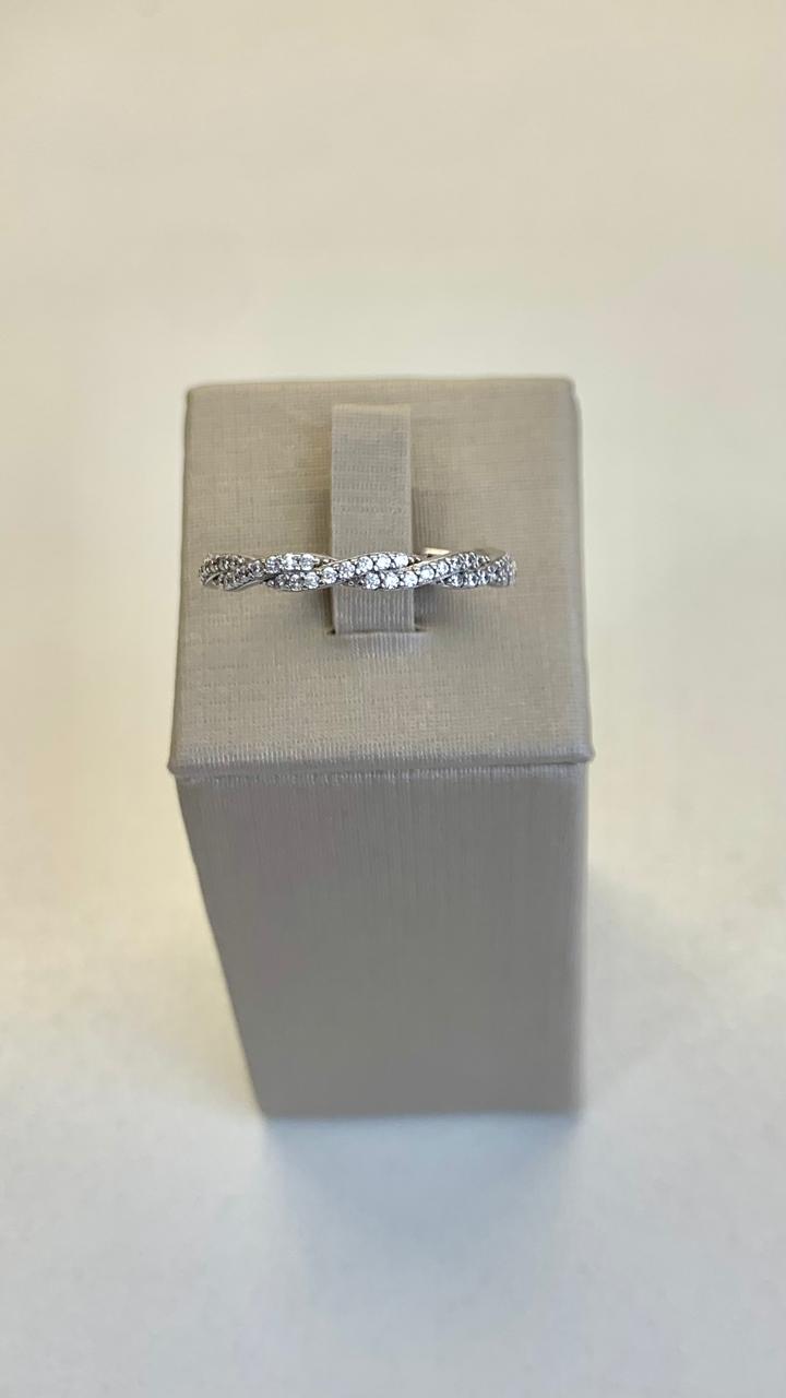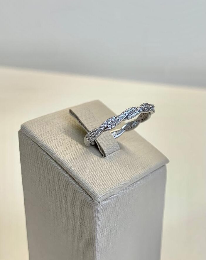Anel torcido cravejado com zircônias, em prata 925 com banho de ouro branco.
