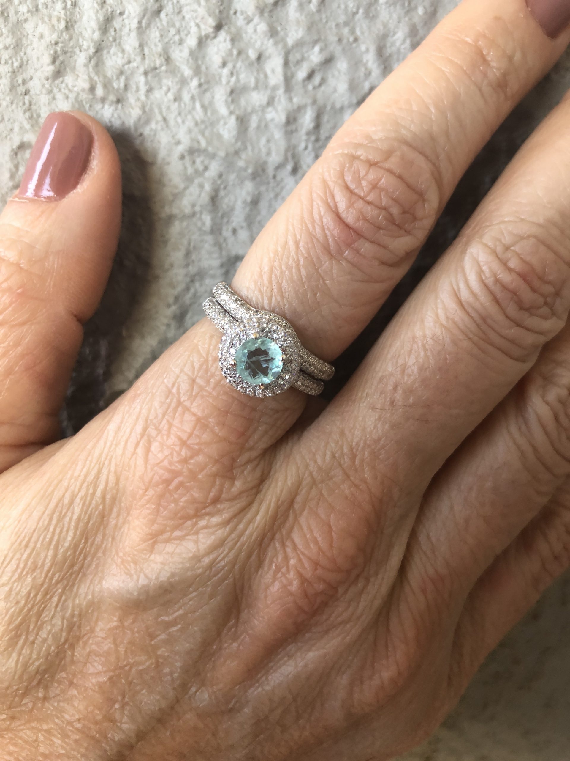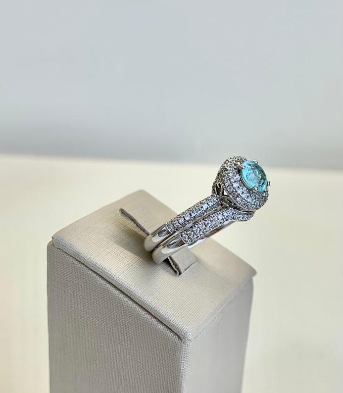Anel duplo, um com pedra de turmalina cravejado de zircônias e um anel cravejado de zircônias em prata 925.