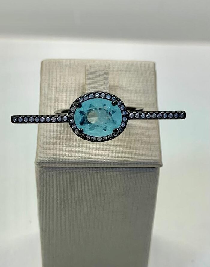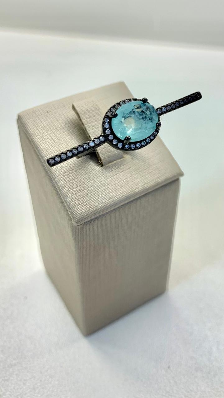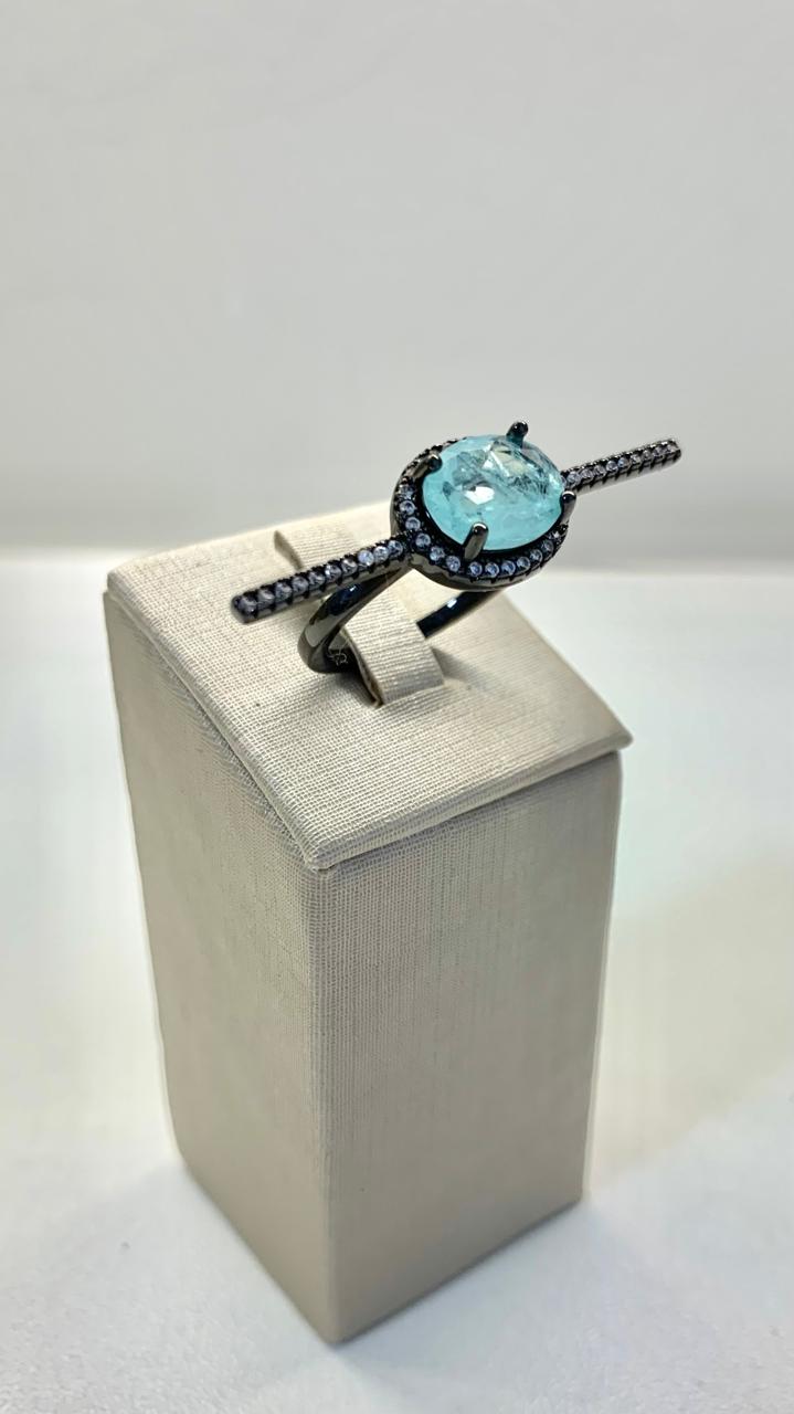 Anel de ródio negro, com um pedra central de turmalina, cravejado de zircônias brancas.