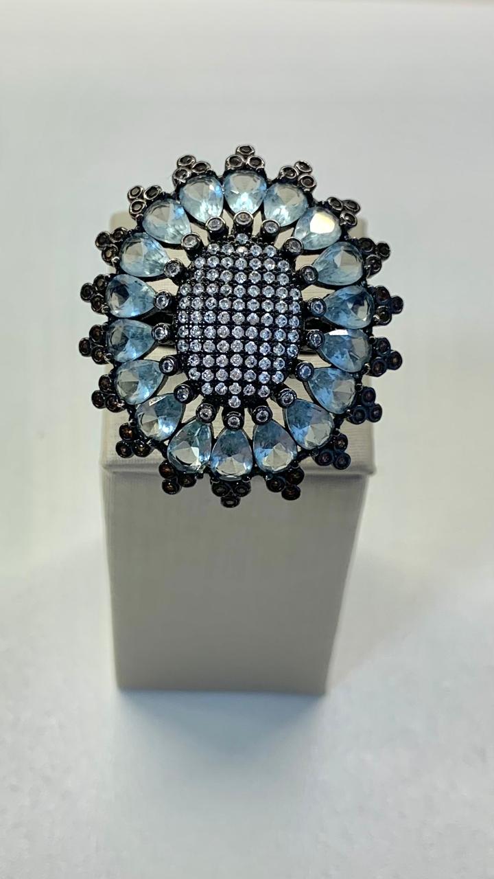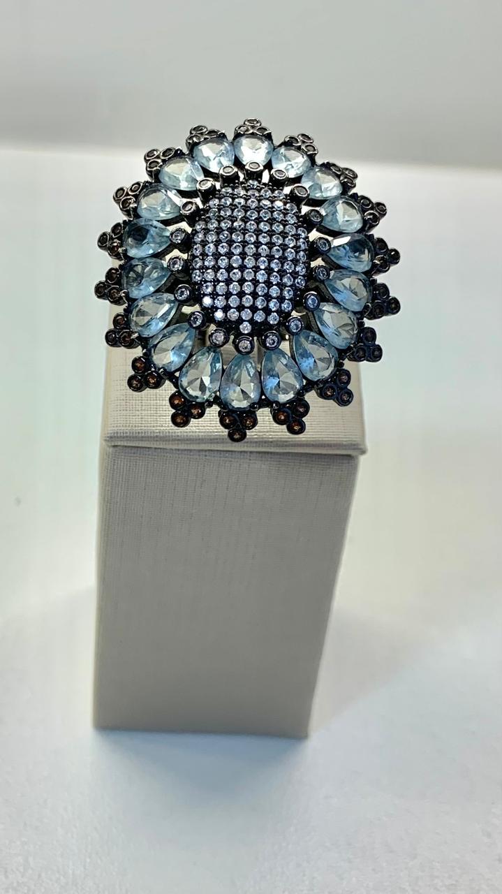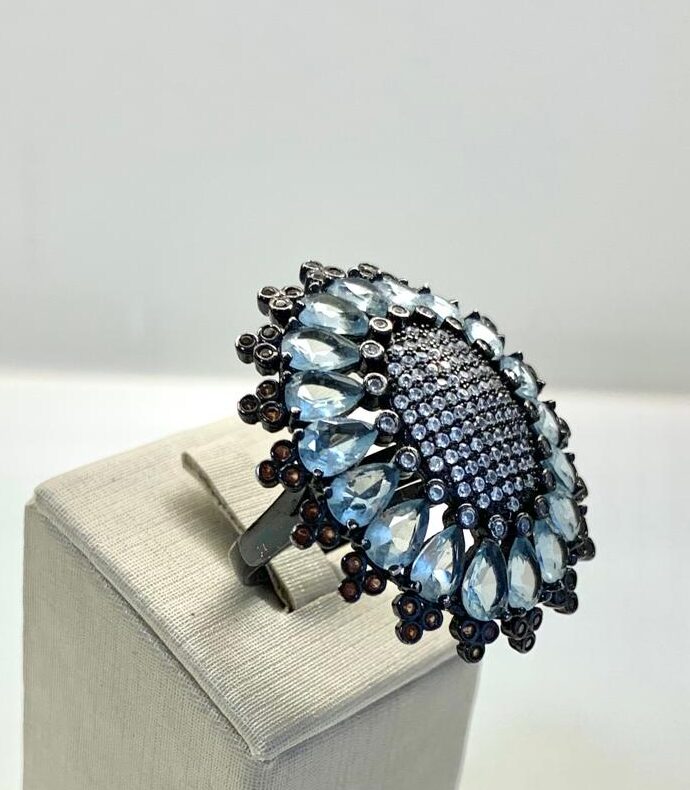 Anel de ródio negro, com gotas de turmalina, cravejado de zircônias brancas e zircônias chocolate.