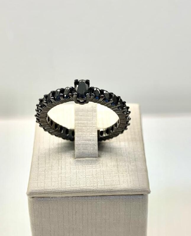 Anel em ródio negro, cravejado de zircônia negra.