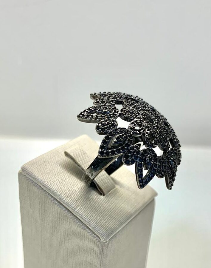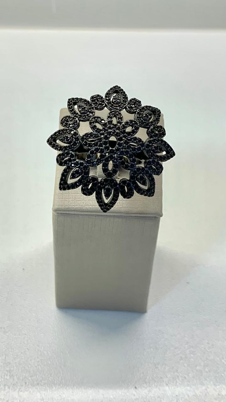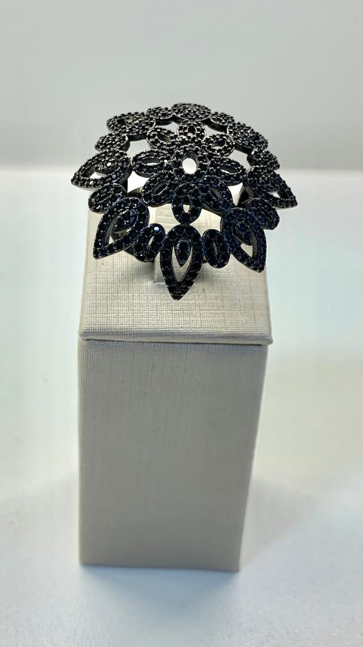 Anel de ródio negro, com uma mandala cravejada de zircônias negras.