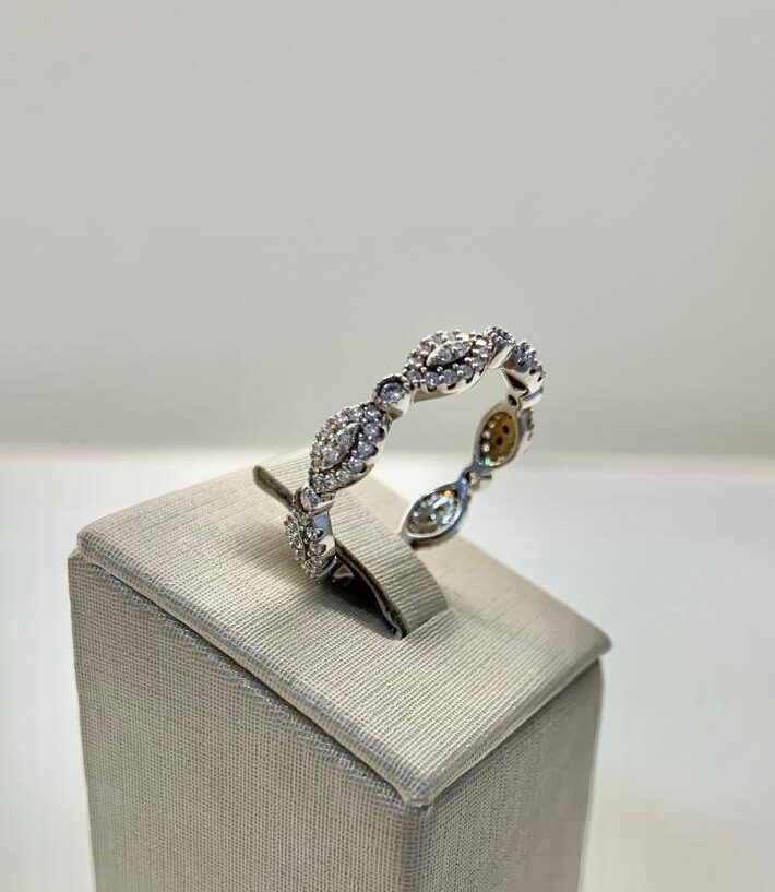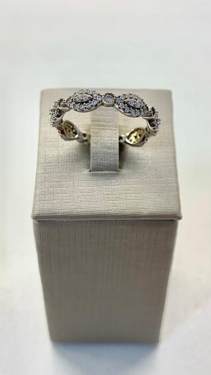 Anel cravejado com zircônias, em prata 925 com banho de ouro branco.