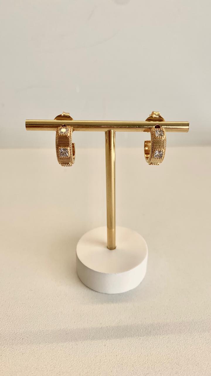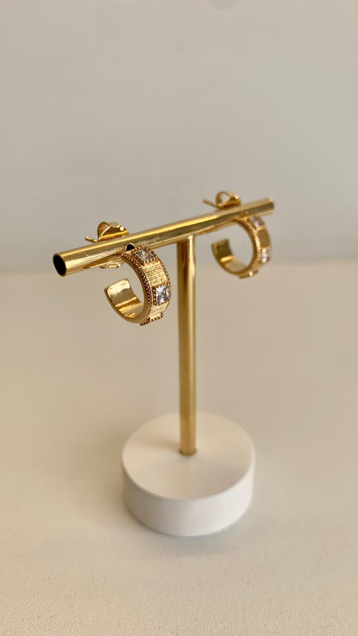 Argola riscada com detalhes em zircônias banhada a ouro 18k.