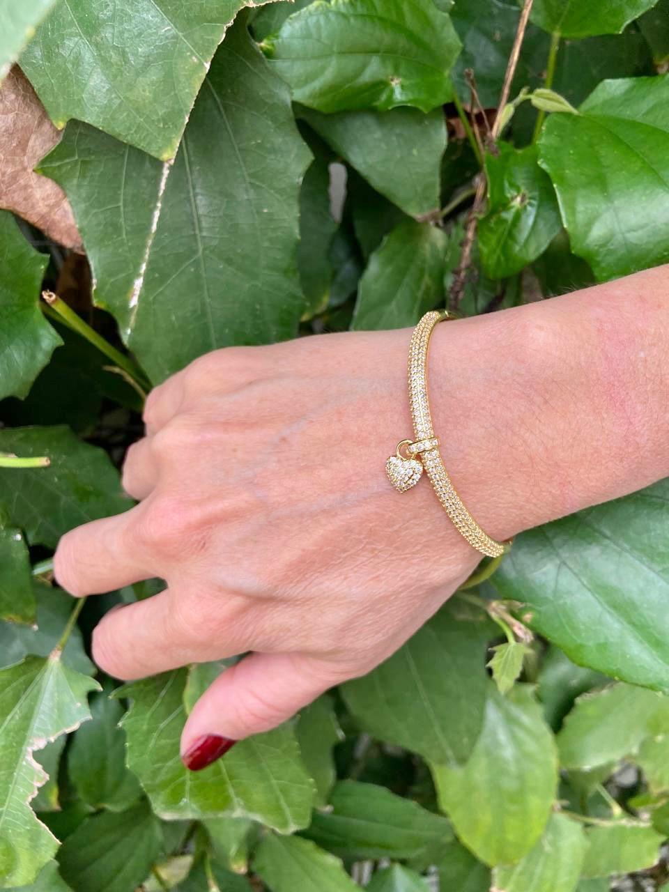 Bracelete cravejado com zircônias brancas e pingente de coração, banhado a ouro18k.