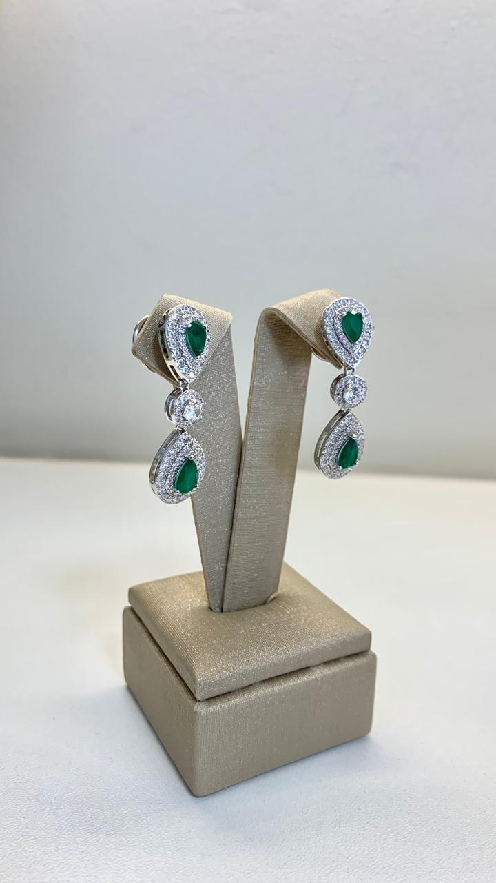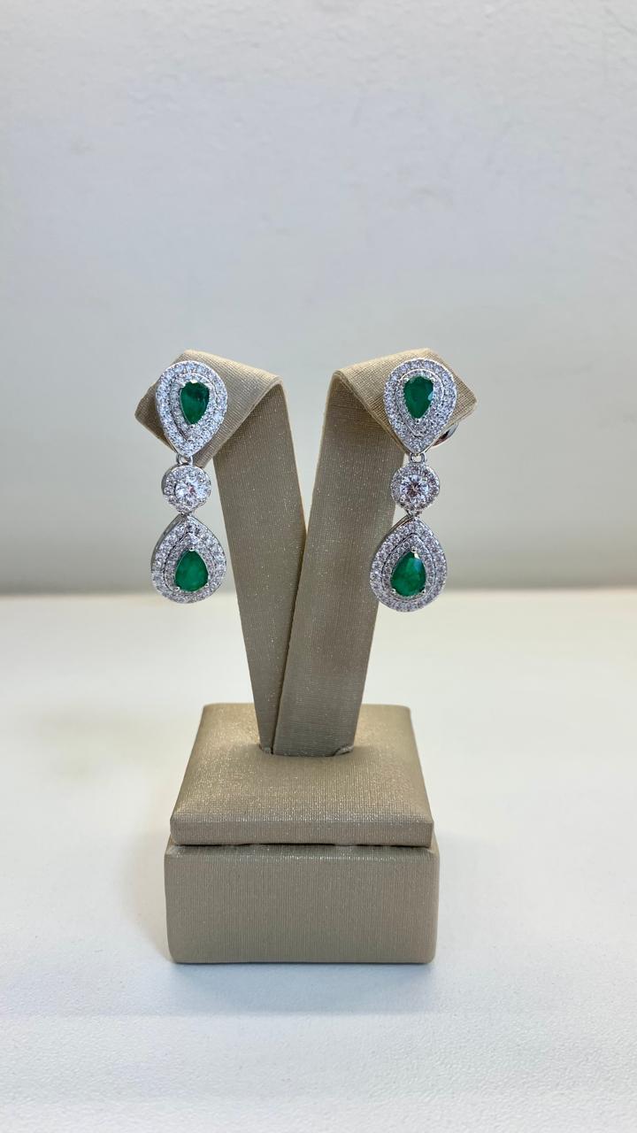 Brinco  gotas de esmeralda, com zircônias ao redor, com ponto de luz, cravejado de zircônias brancas, em ródio branco.