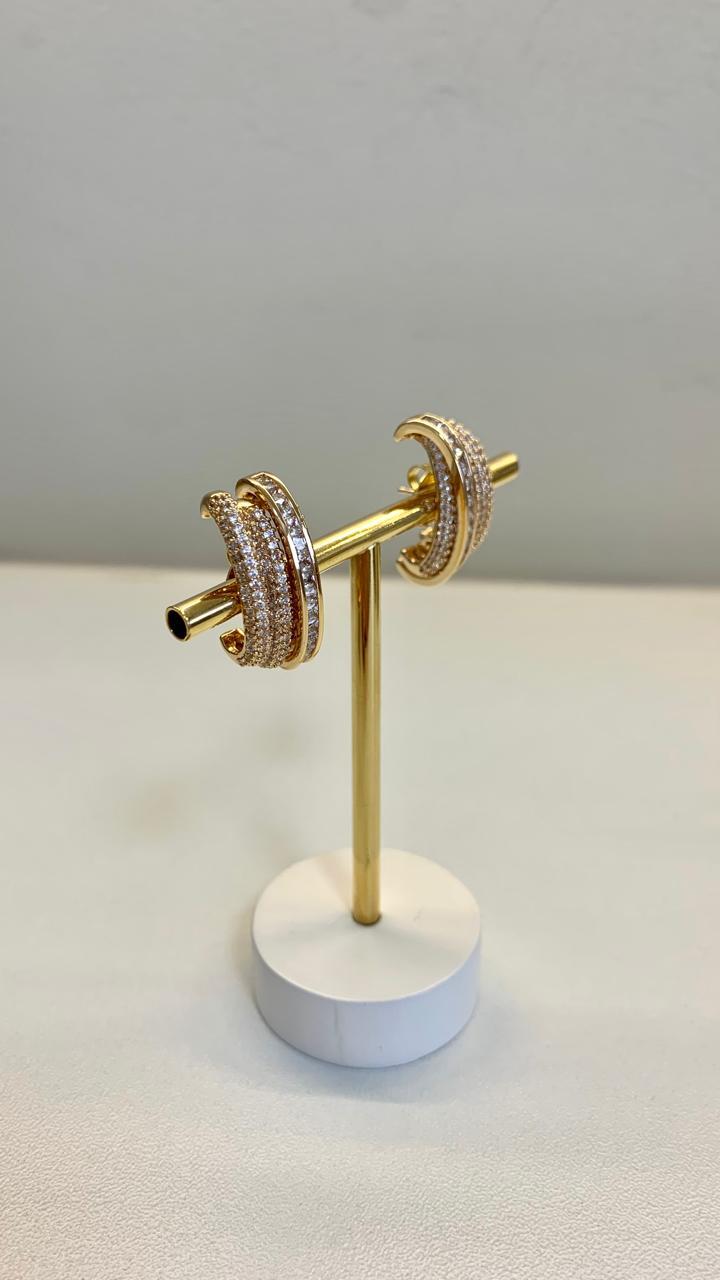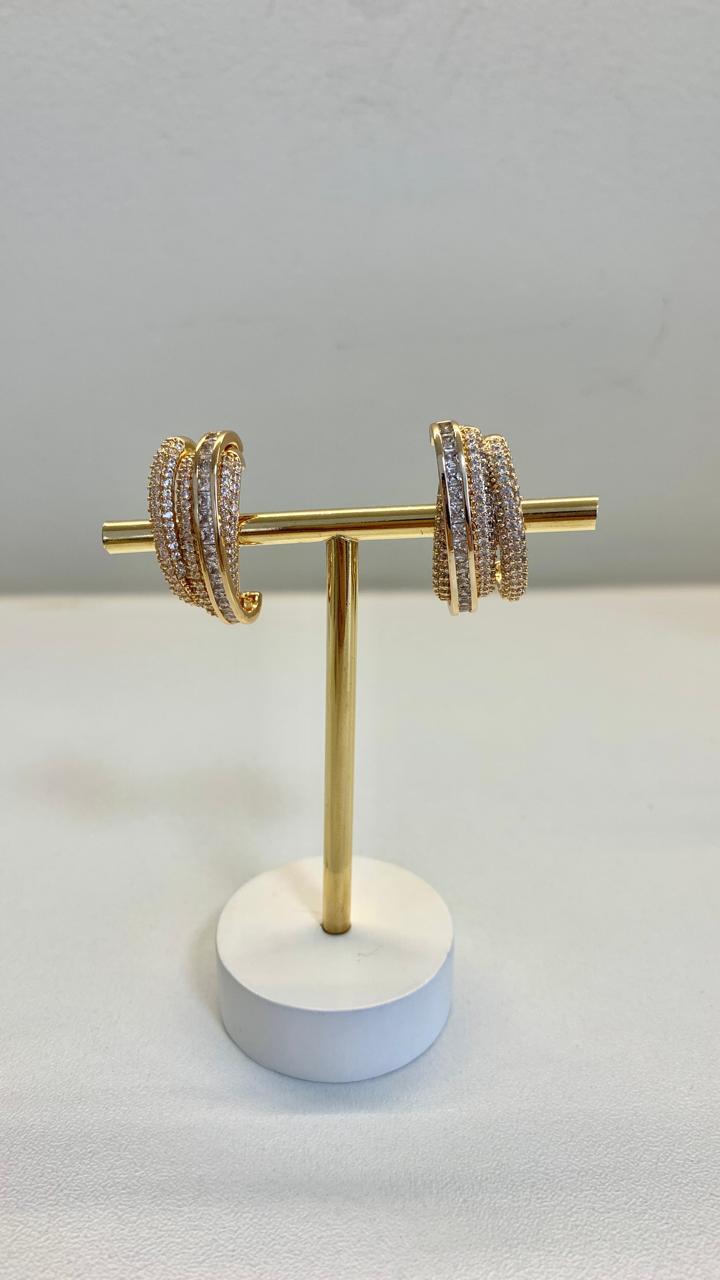Brinco 4 fileiras cravejado com zircônias brancas, banhado a ouro 18k.