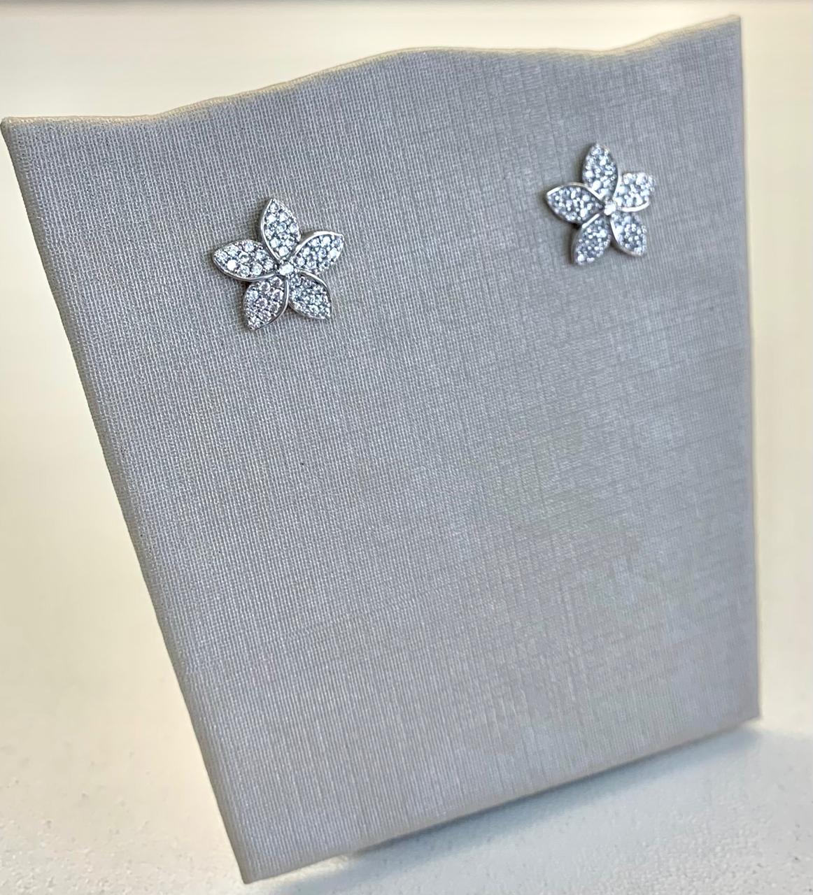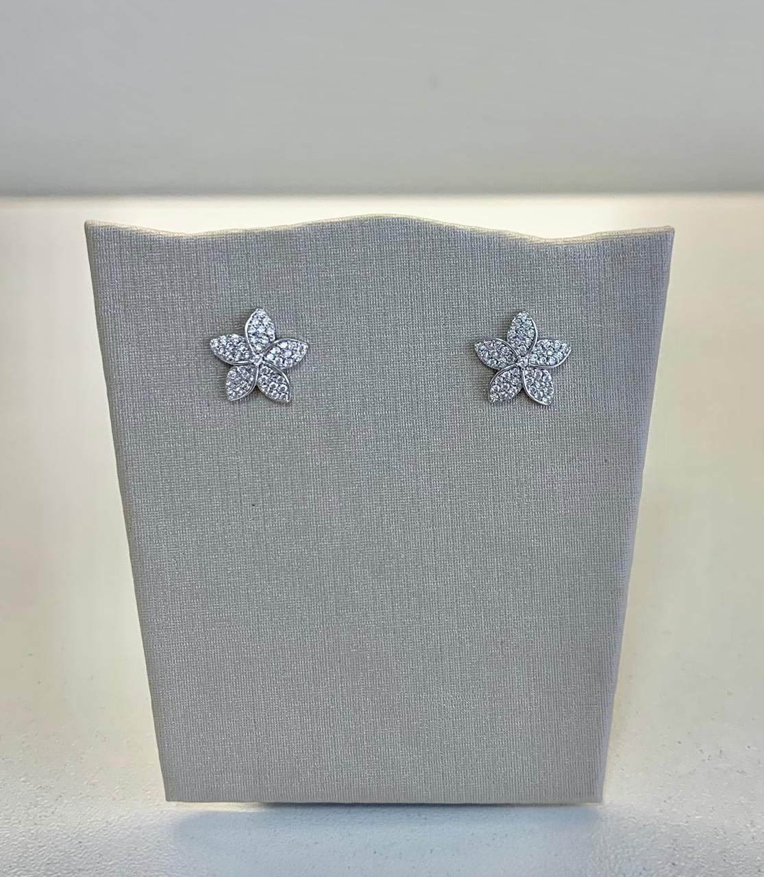 Brinco de prata 925, flor com 5 pétalas cravejadas de zircônias.