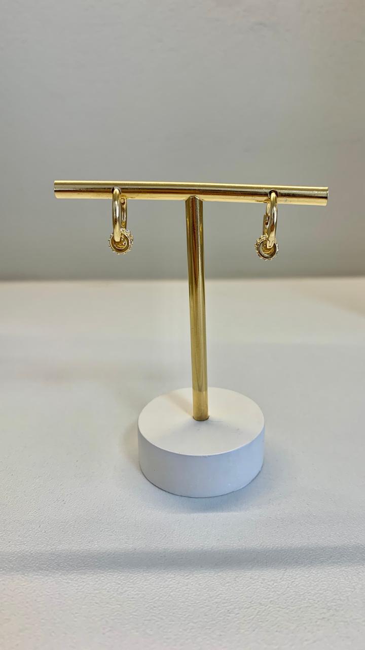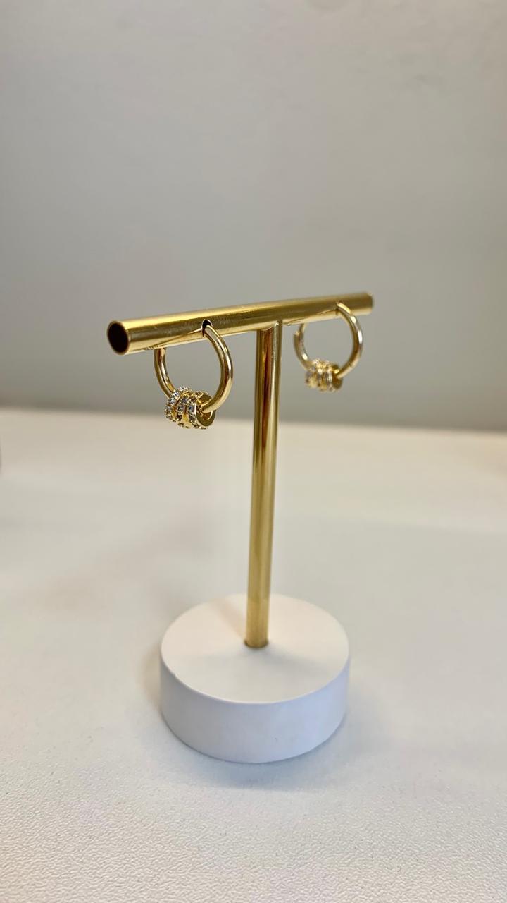 Brinco argola com 3 pingentes de argolinhas cravejadas com zircônias brancas, banhado a ouro 18k.