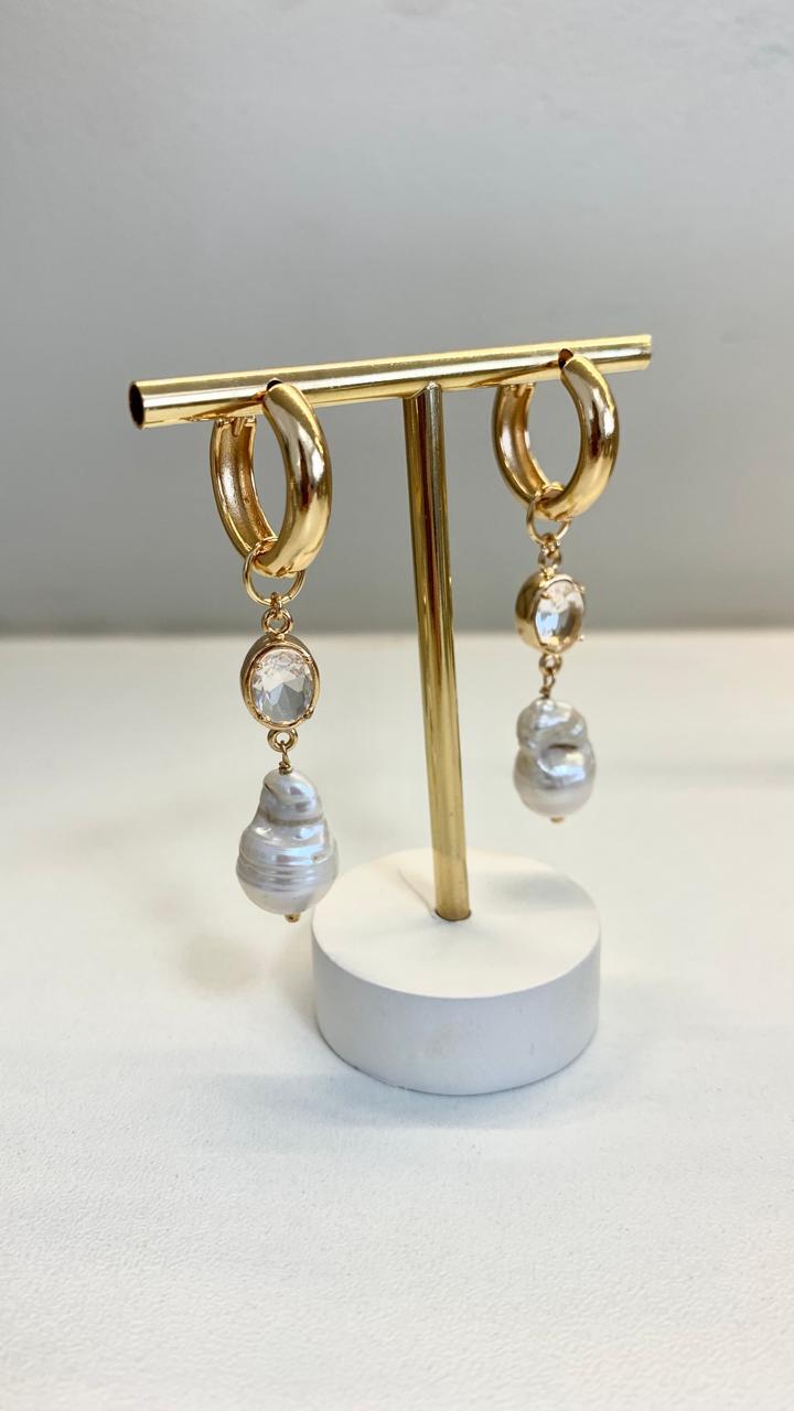 Brinco argola com pérola barroca e zircônia branca, banhado a ouro18k