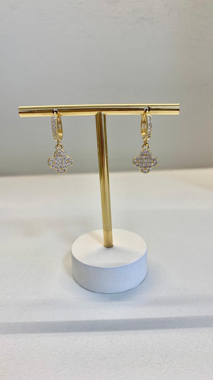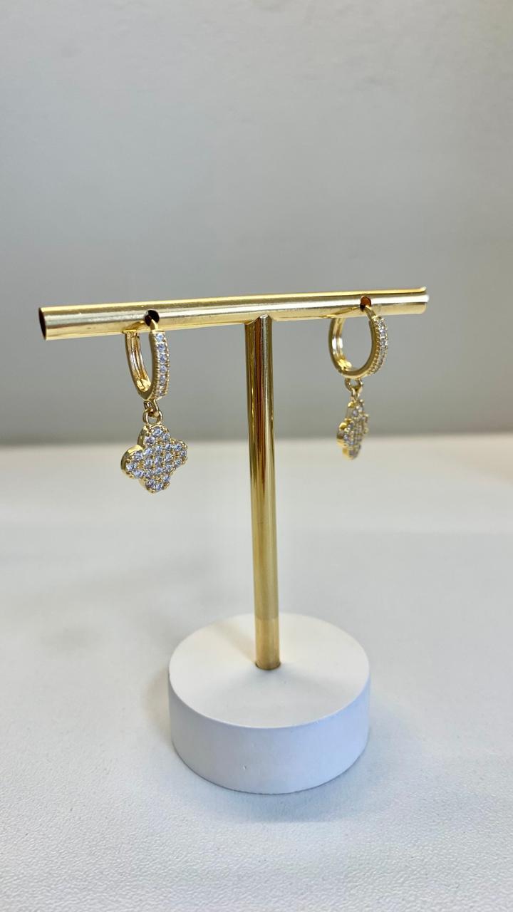 Brinco argola trevo cravejada com zircônias brancas, banhado a ouro 18k.