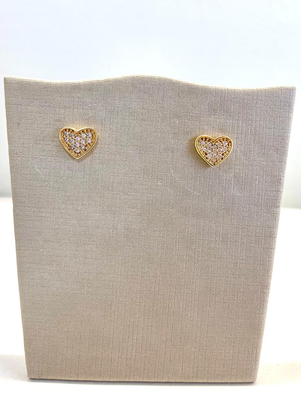 Brinco coração, cravejado de zircônias, banhado a ouro 18k.
