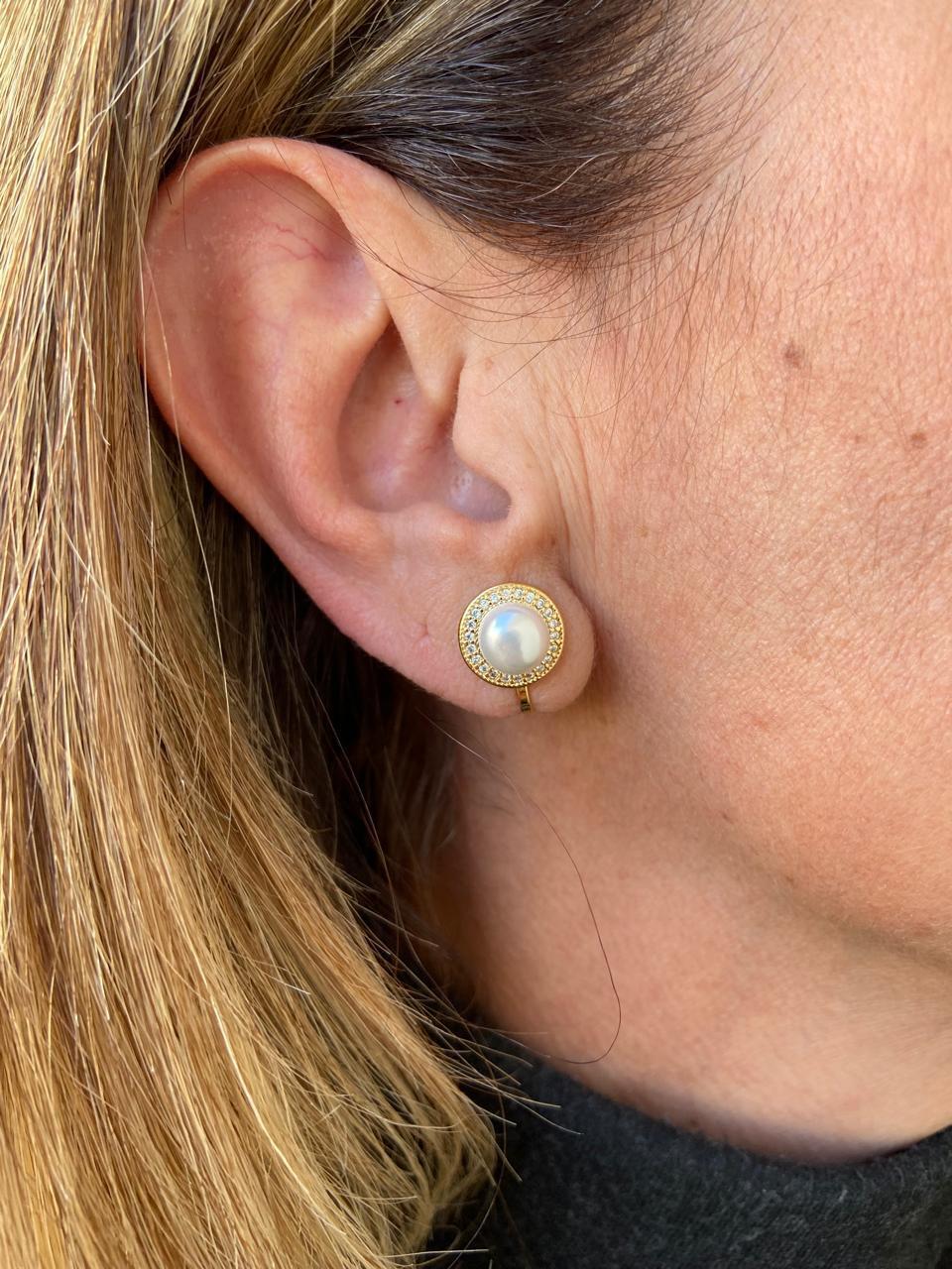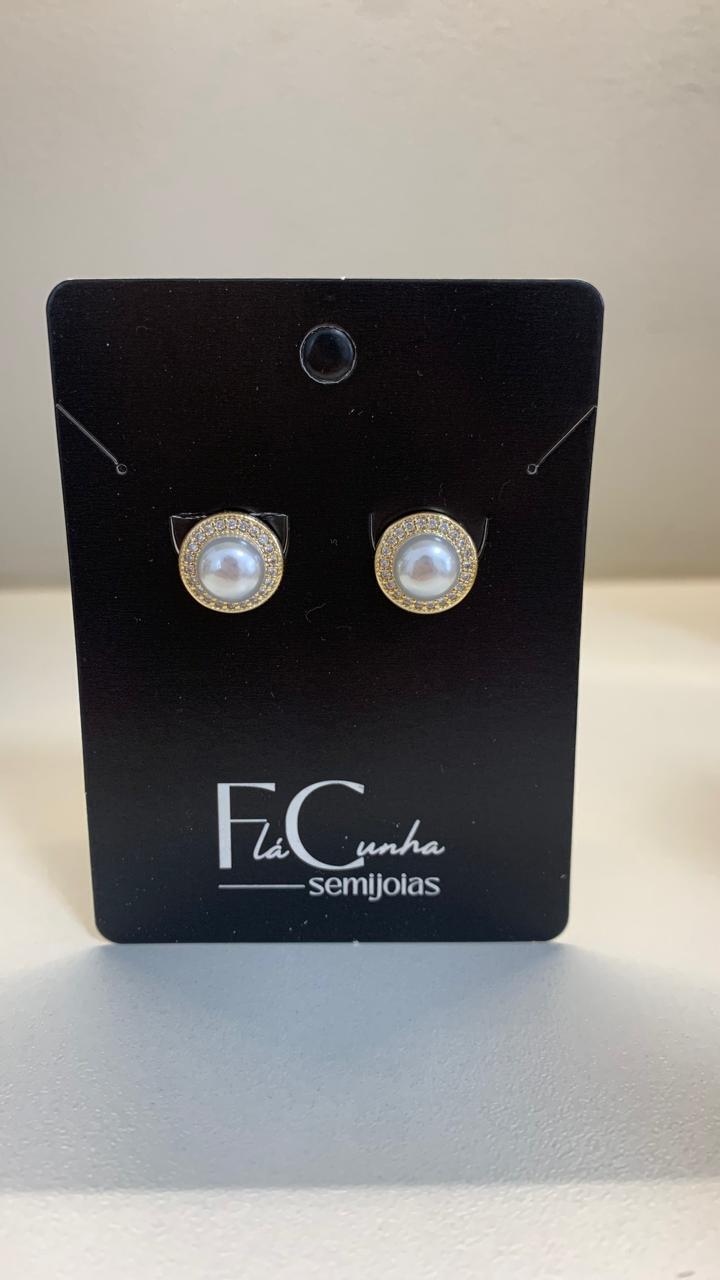 Brinco de pressão pérola com cravação de zircônias brancas, banhado a ouro18k.