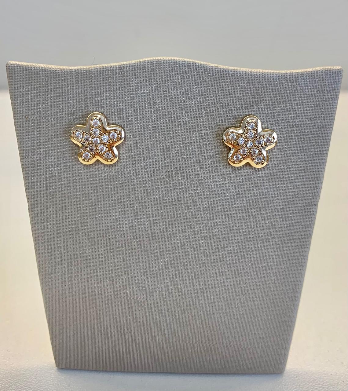 Brinco Flor 5 pétalas cravejado com zircônias, banhado a ouro 18k.