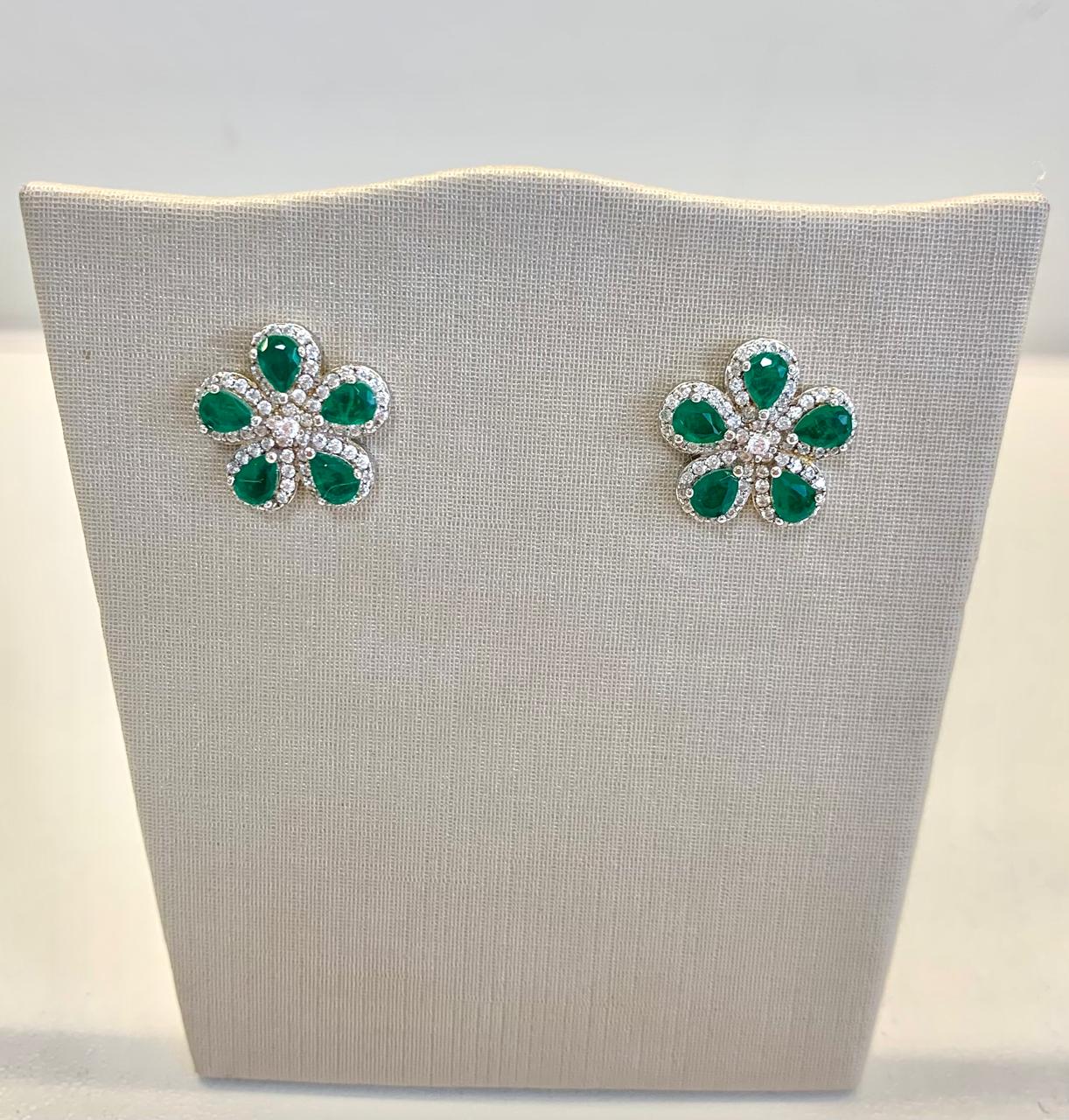 Brinco flor esmeralda cravejada com zircônias de prata 925.