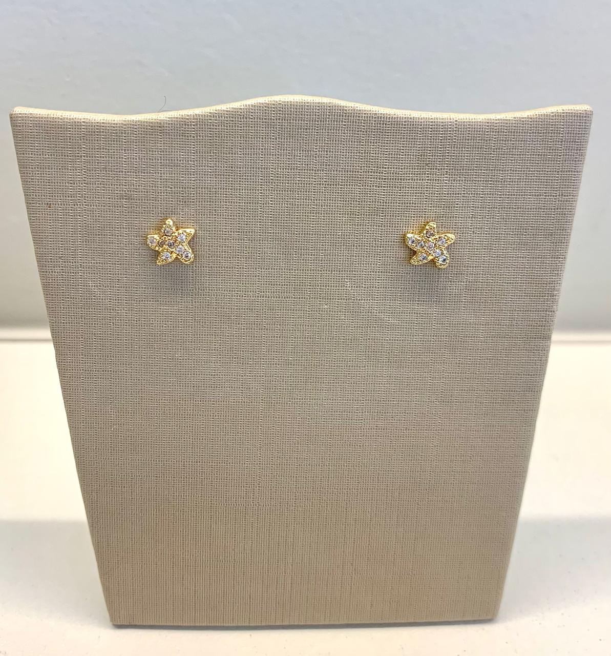 Brinco flor estilizada banhado a ouro 18k, cravejada de zircônias.