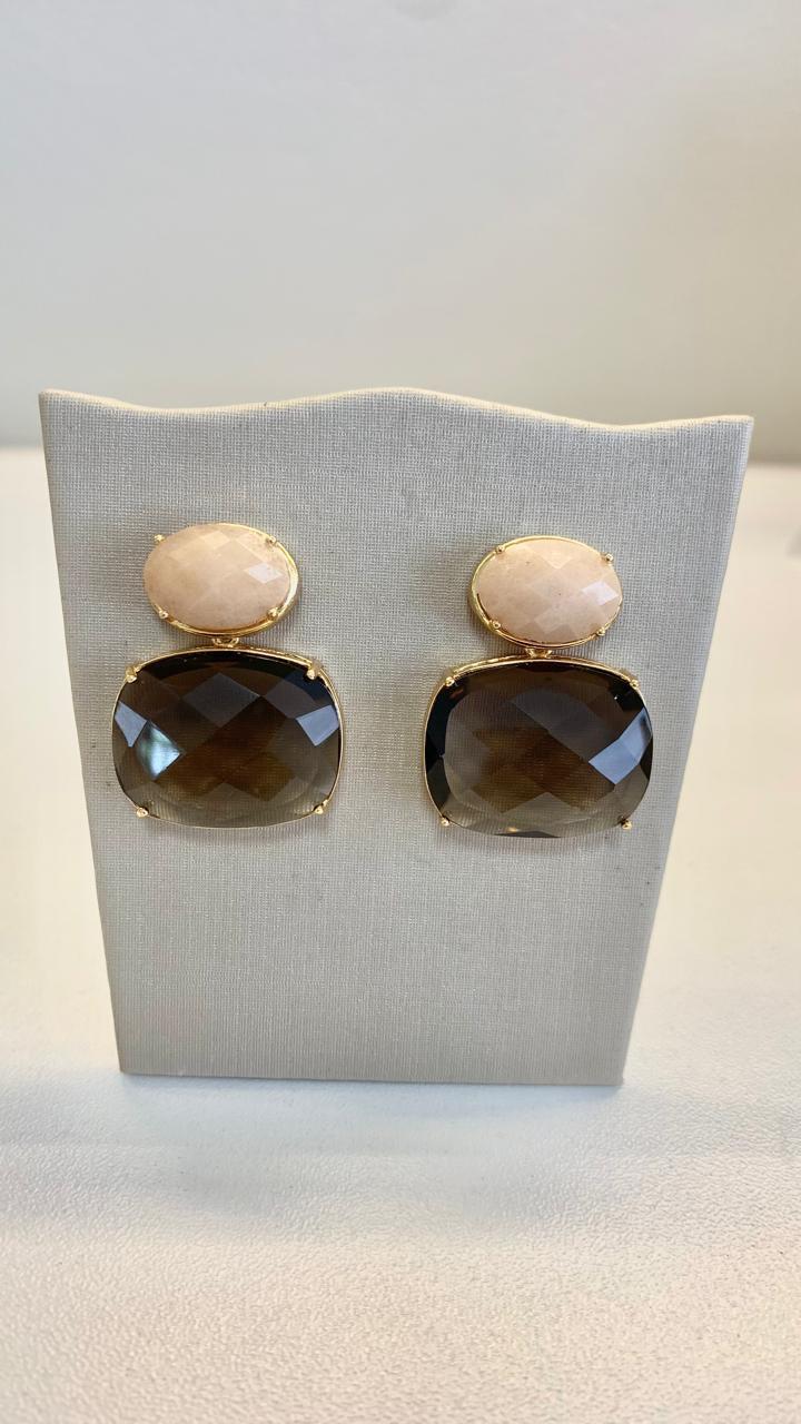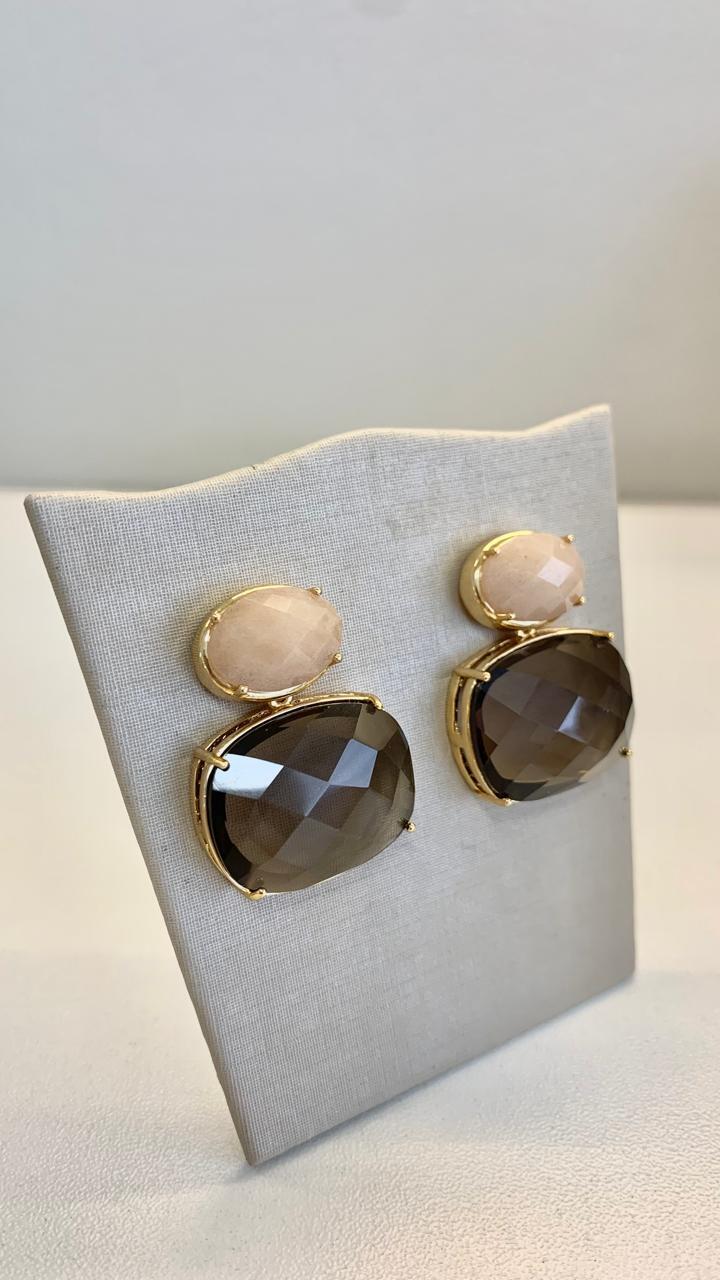 Brinco com pedra natural jade nude e quartzo fumê, banhado a ouro18k.