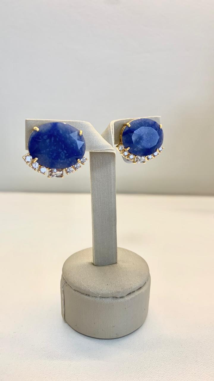 Brinco pedra natural lápis lazuli com zircônias brancas, banhado a ouro18k.