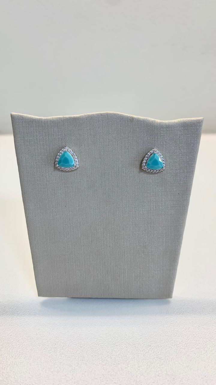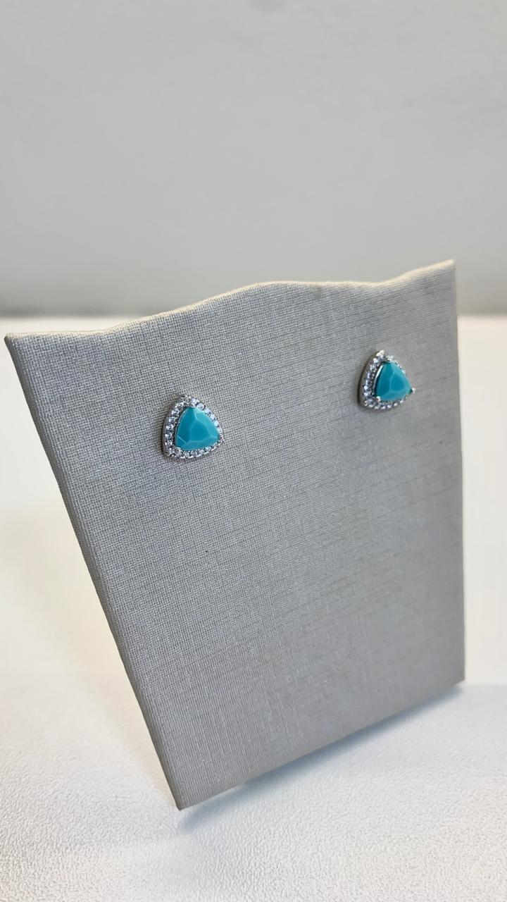 Brinco nano turquesa cravejado com zircônias brancas ao redor, em prata 925.