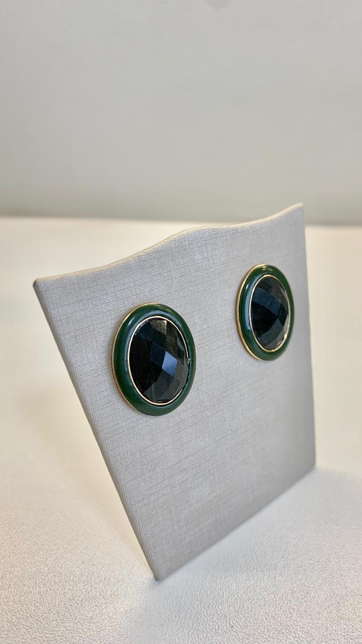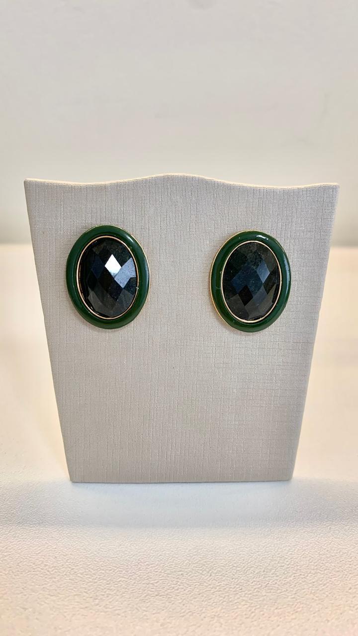 Brinco oval com pedra natural jasper verde, banhado a ouro 18k.