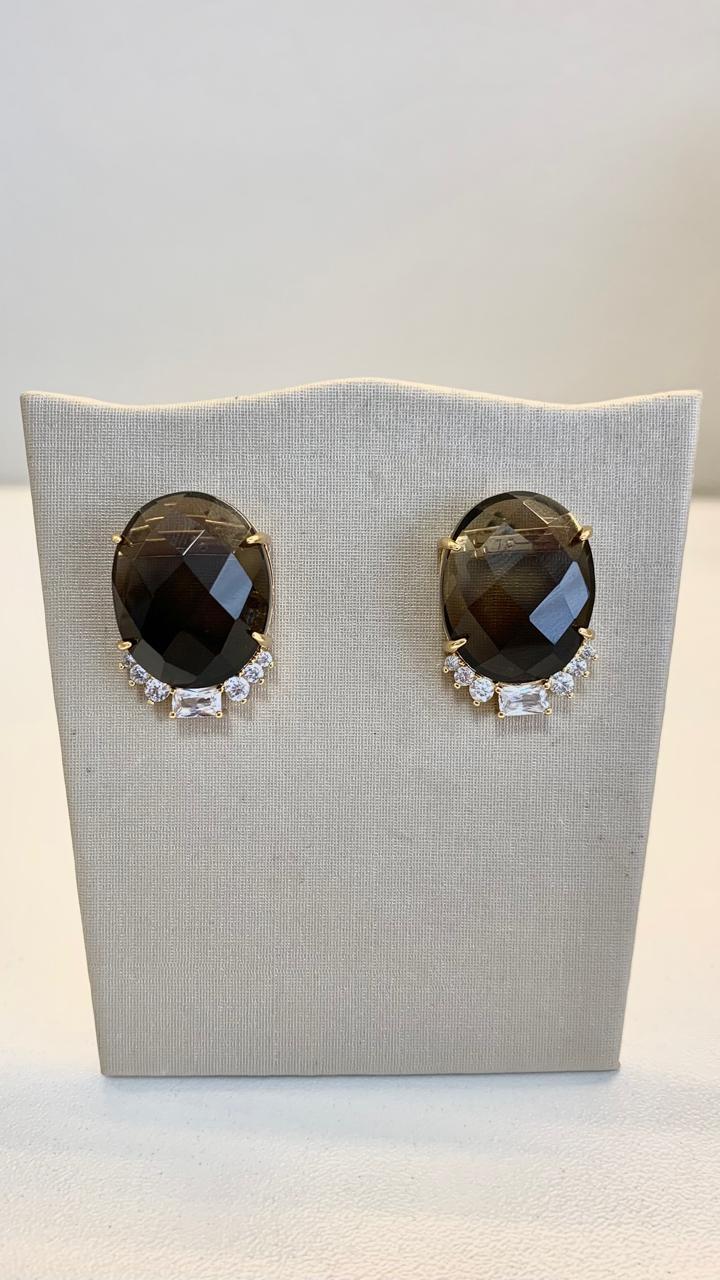 Brinco oval com pedra natural quartzo fumê cravejado de zircônias brancas, banhado a ouro18k.