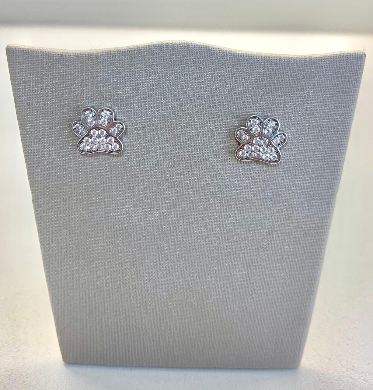 Brinco pata de cachorro, cravejada com zircônias, em prata 925.