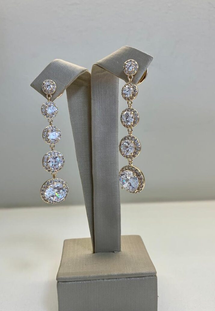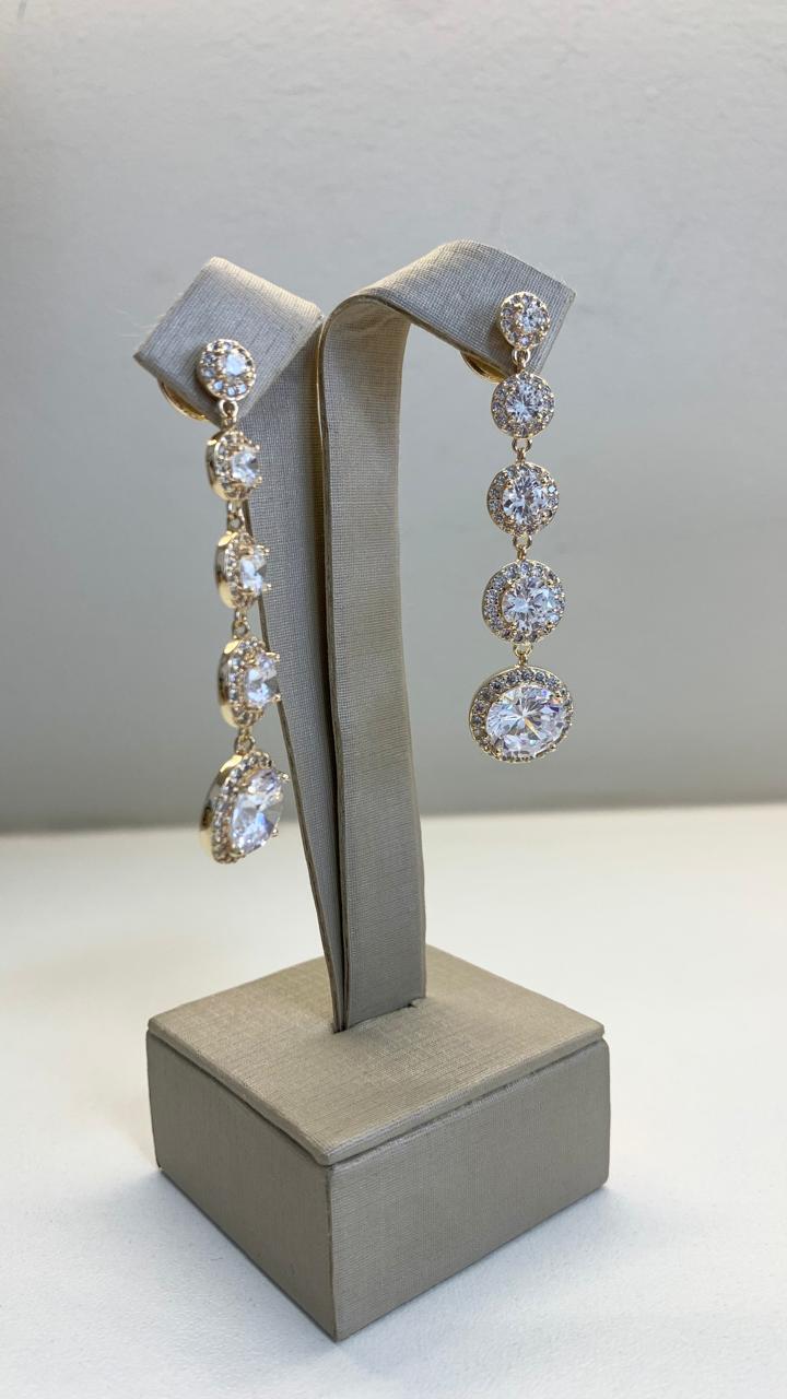 Brinco pendulo, com 5 círculos decrescentes de zircônias, com zircônias ao redor, banhado a ouro18k.