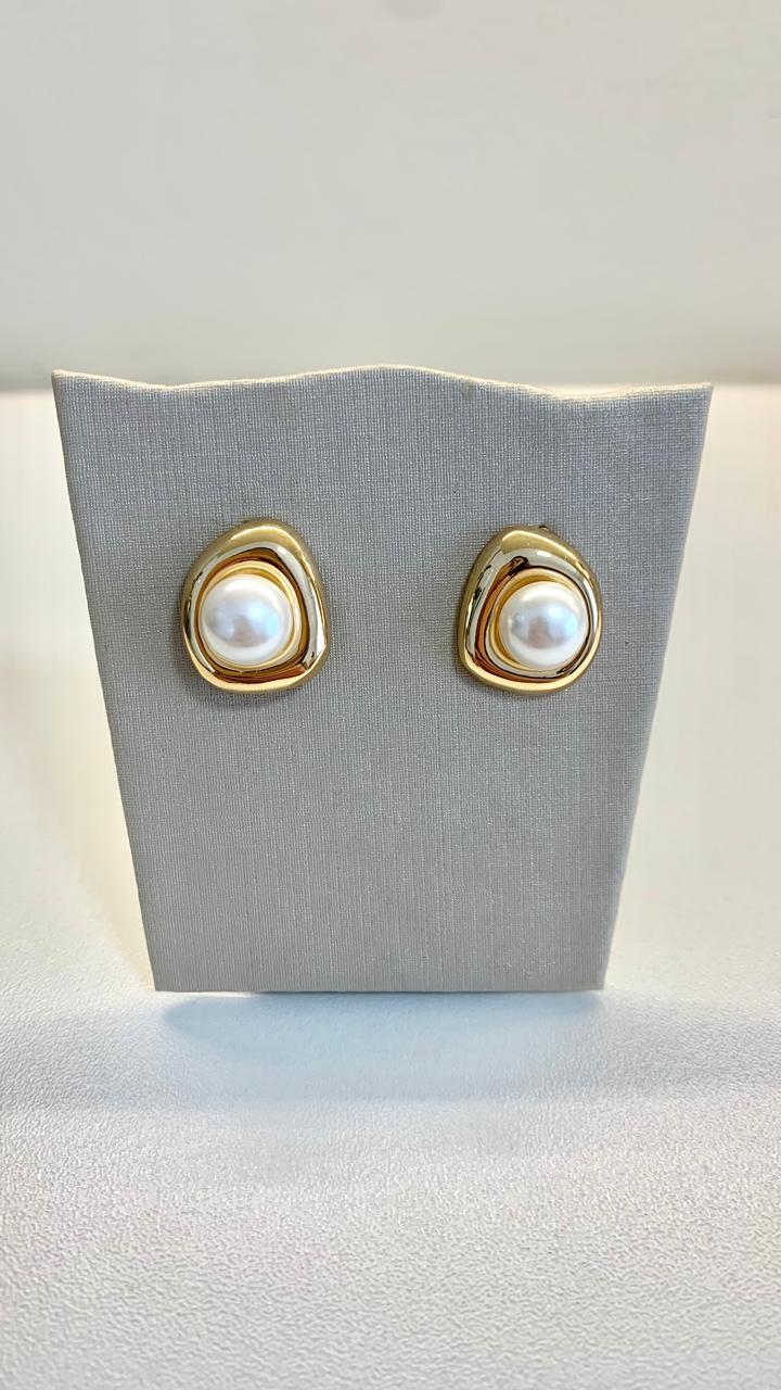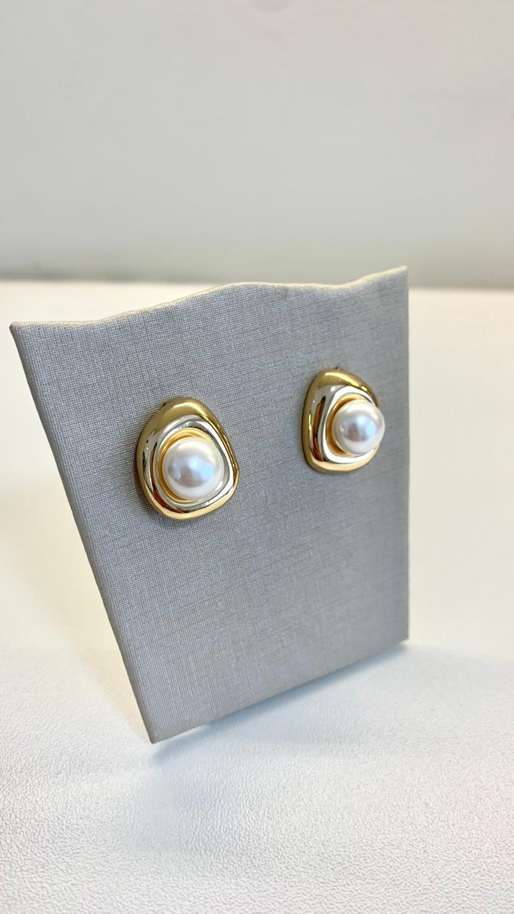 Brinco pérola central com placa em ouro18k.