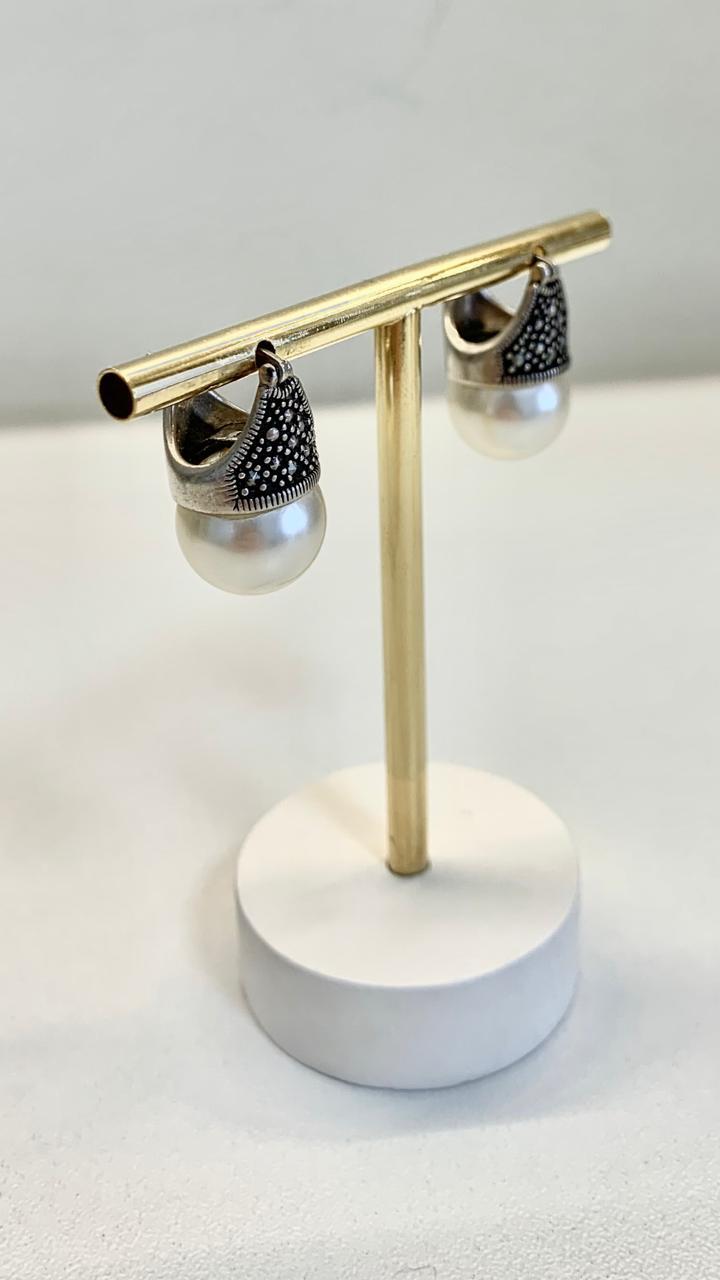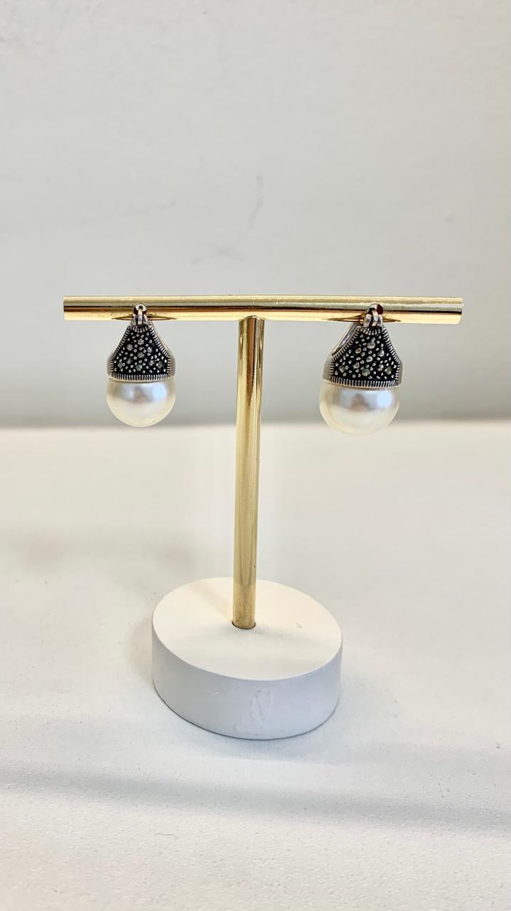 Brinco pérola e pedra marcassita, em prata 925.