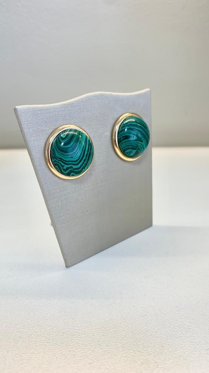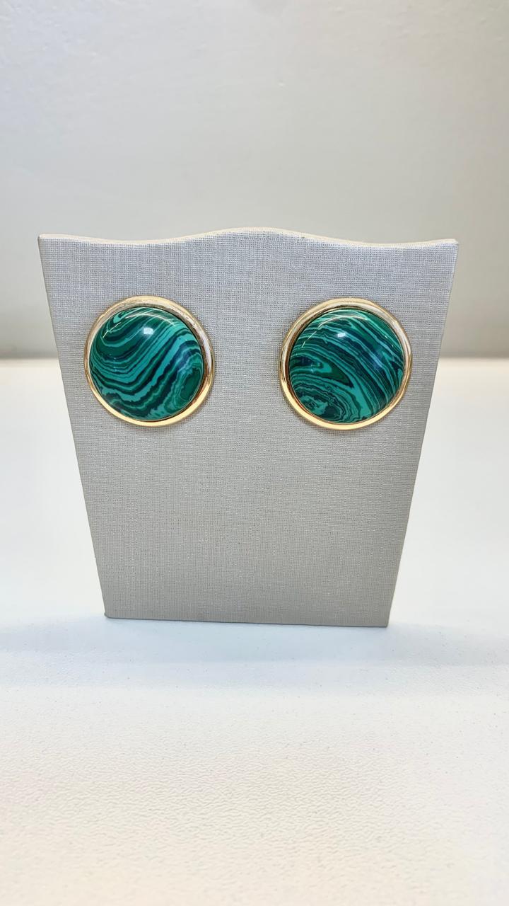 Brinco redondo pedra natural malaquita, banhado a ouro18k.