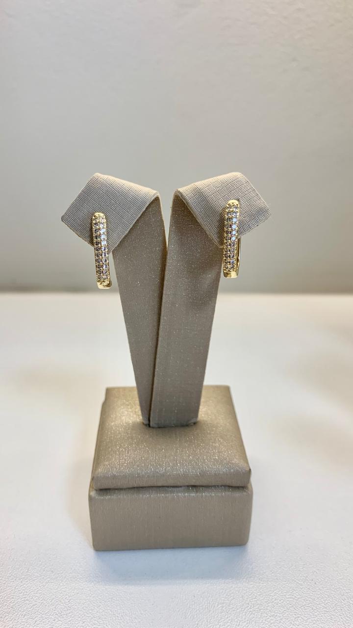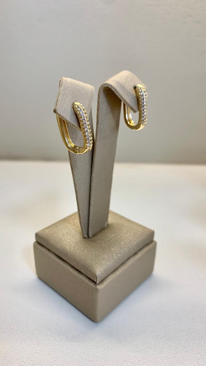 Brinco retangular G cravejado de zircônias  brancas, banhado a ouro18k.