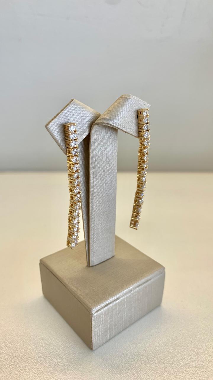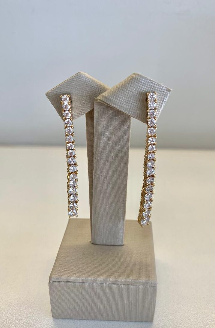 Brinco riviera, reto com zircônias brancas, banhado a ouro 18k.