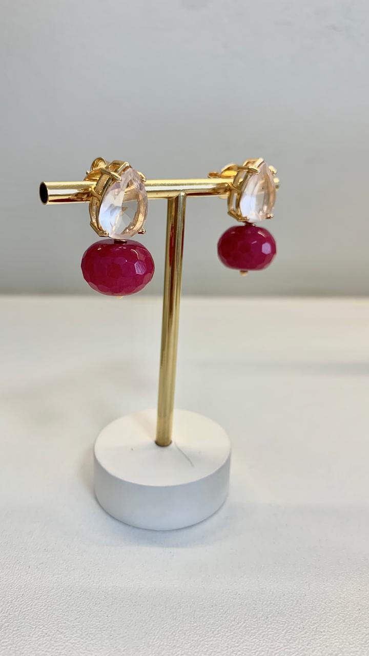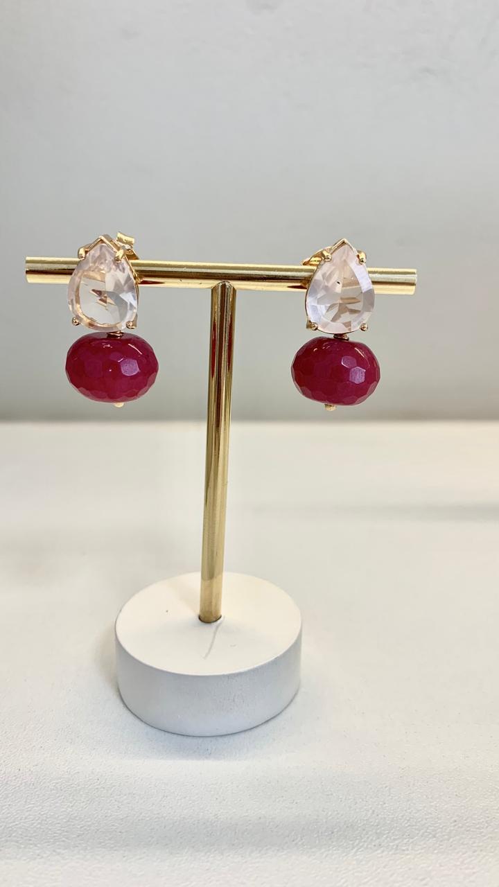 Brinco pedra natural rubi com quartzo rosa, banhado a ouro18k.