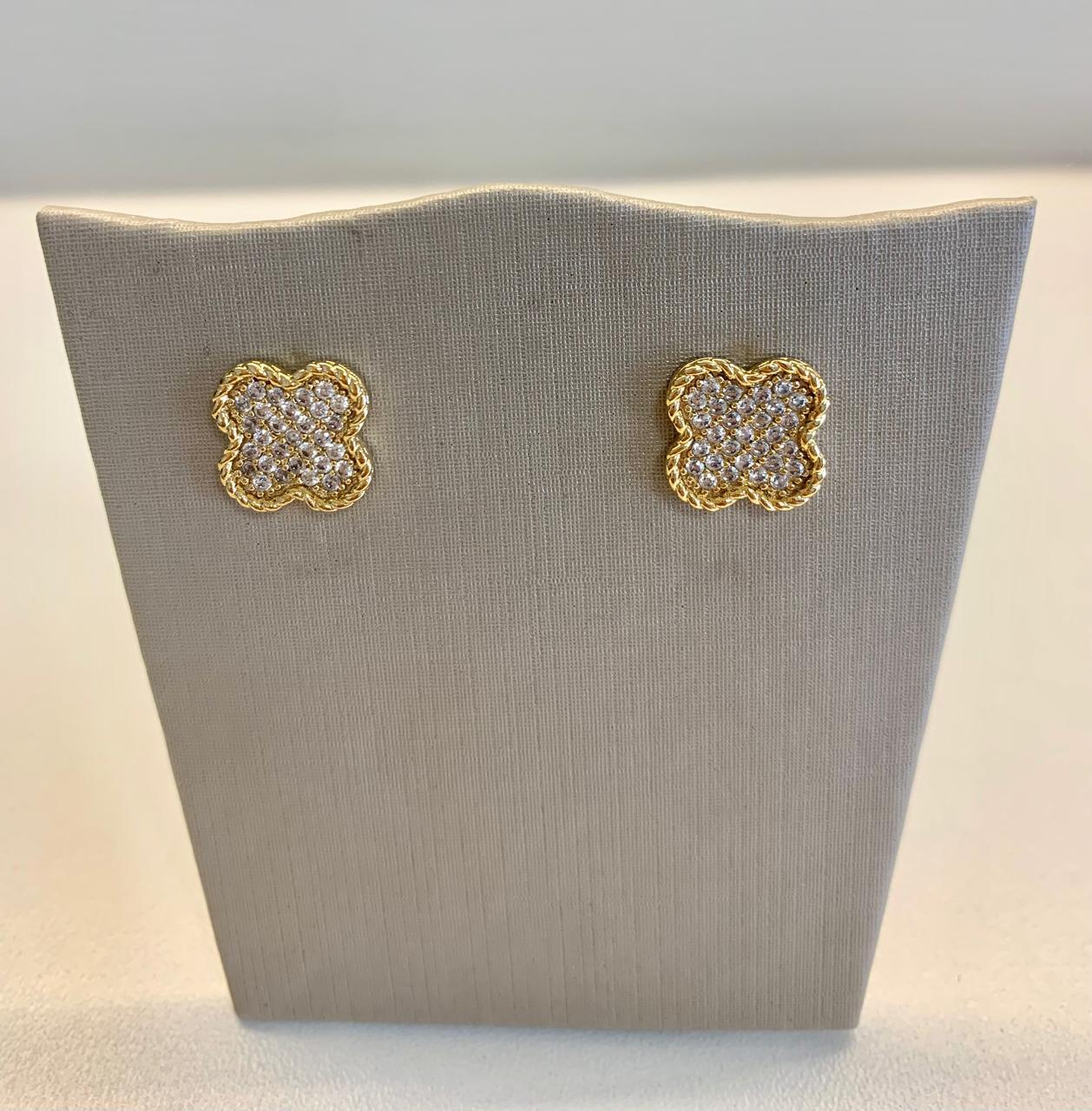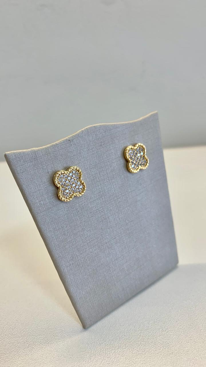Brinco trevo G cravejado de zircônias, banhado a ouro18k.