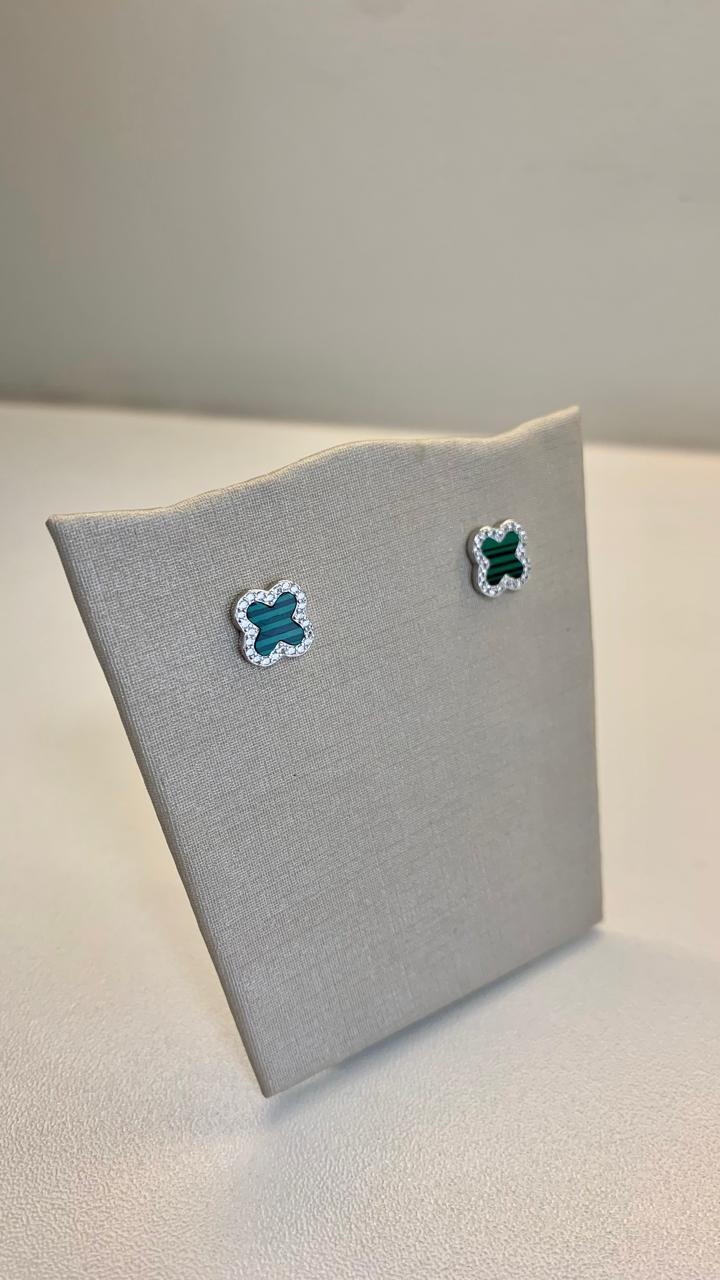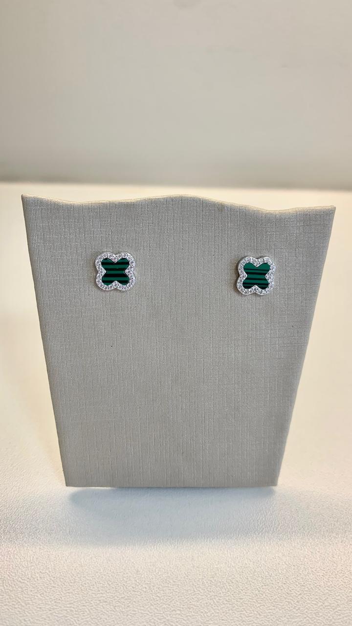 Brinco trevo com pedra natural malaquita cravejado com zircônias brancas ao redor, em prata 925.